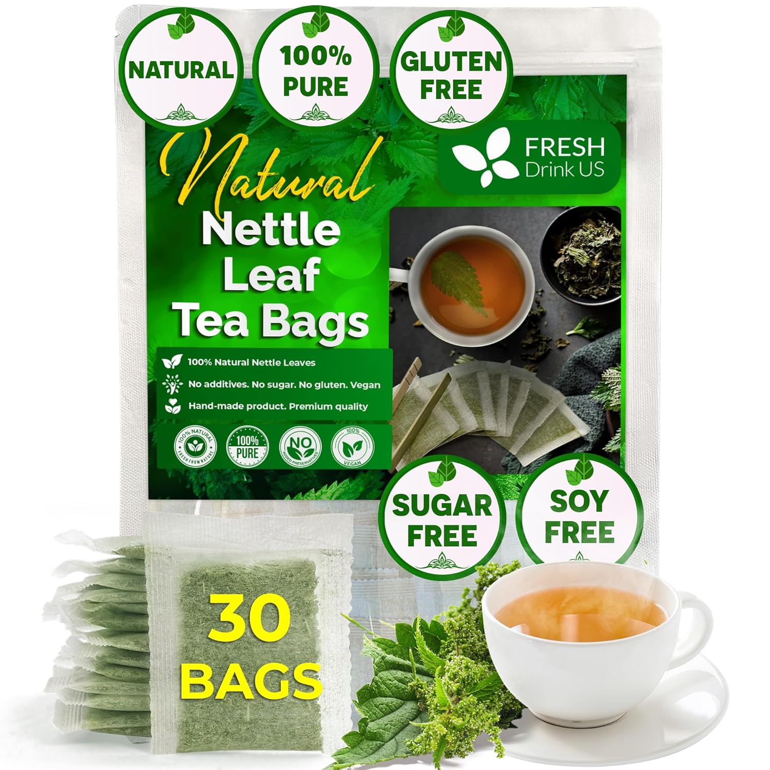 FreshDrinkUS, 30 Nettle Leaf Tea Bags, 100% Natural & Pure from Nettle Leaves. Loose Leaf Nettle Herbal Tea. Nettle Leaf Tea. No Sugar, No Caffeine, No Gluten, Vegan.