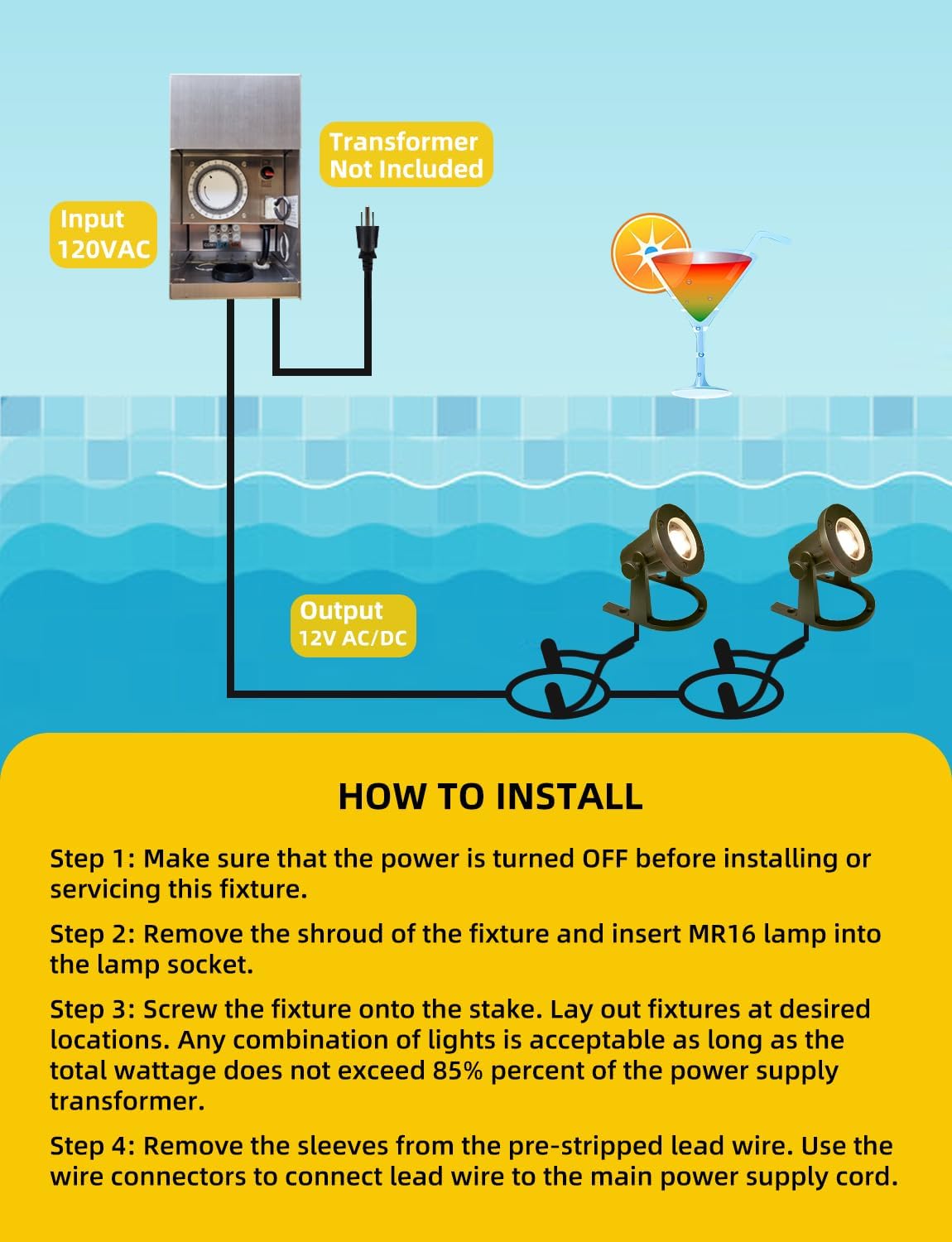• Energy Efficiency: The heavy-duty patio pond underwater LED lights are energy efficient, with 5W, 2700K, 45 degree LED MR16 bulbs that will help you save up to 80% in electricity costs. They are suitable for an average of 50,000 hours to avoid the trouble of frequently replacing the bulb. Experience true color rendition with our 85+ CRI landscape lights.Please note that this LED pond light doesn't have plug, must be powered by a 12-24V low-voltage transformer (not included).