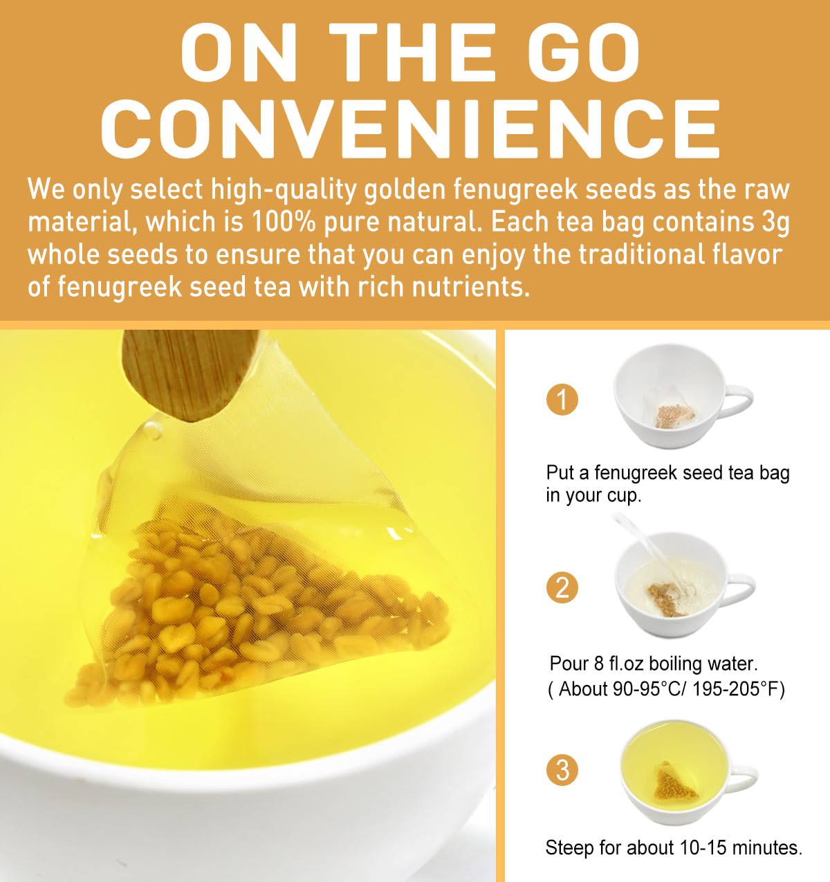 • PREMIUM INGREDIENTS: We select high-quality golden fenugreek seeds as the raw material, which is pure natural without any artificial additives. Each teabag contains 3g whole seeds to ensure the traditional flavor of fenugreek seed tea with rich nutrients;