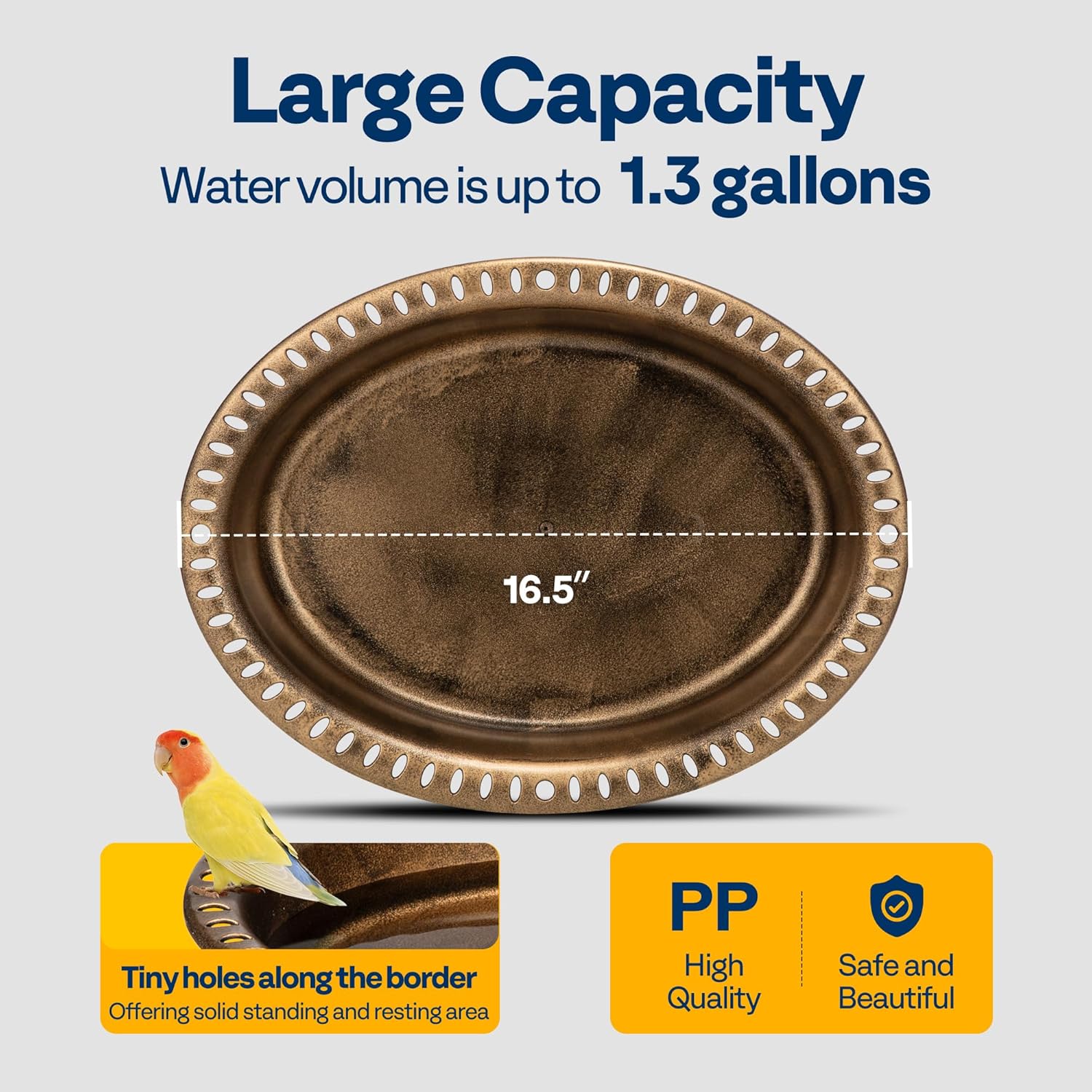 • LARGE CAPACITY - This extra-large bird bath features an oval tray with tiny holes along the border, offering a solid standing and resting area for your feathered companions; The bird bath has a capacity of 1.3 gallons and a diameter of 16.5 inches, which will hold enough water or food for your wonderful avians and butterflies to enjoy, and a depth of 3.5 inches is sufficient to accommodate a solar fountain pump or a bird bath deicer (Bowl dimension: 16.5” L×12.6” W, bowl depth: 3.5 inches)
