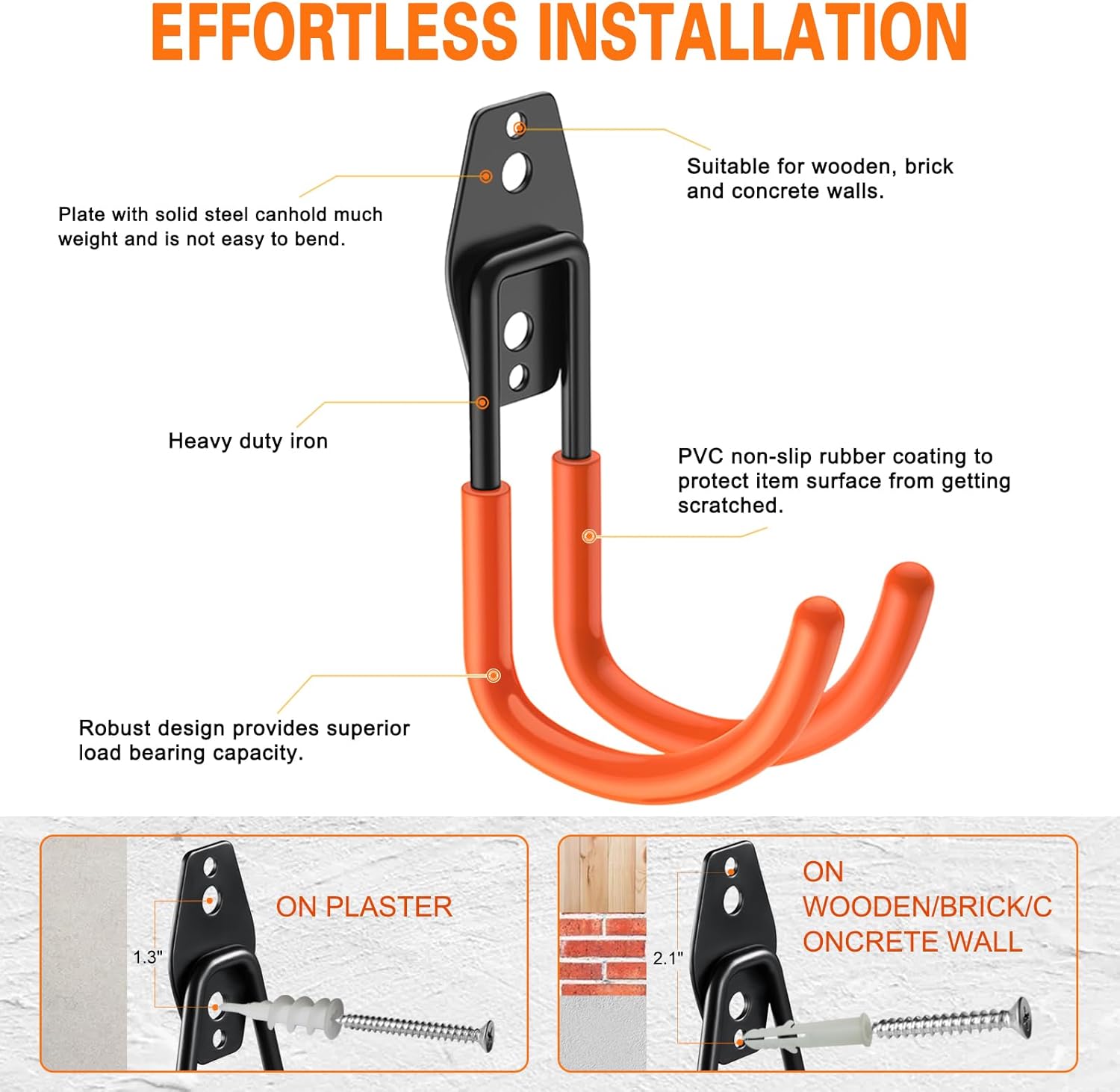 • Heavy-Duty Hooks: Four 3.9 inch J shaped wall mounted garage hooks, The tubular double bar hooks design makes the garage utility storage hooks more stable than regular single tong hooks.