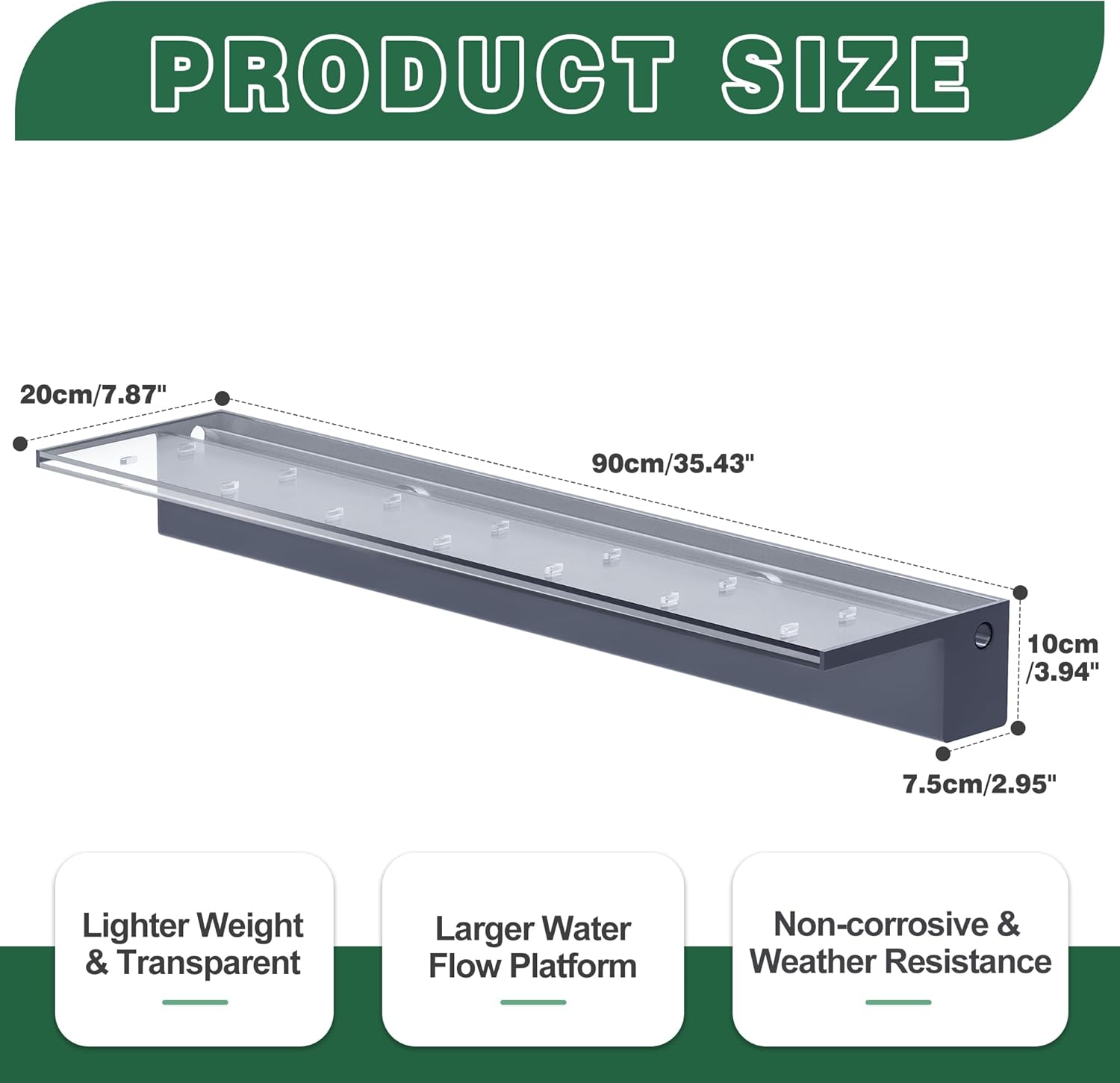 • 【Updated Water Flow Platform】- Unlike other narrow, short waterfalls, our updated pond waterfall features an integrated 8-inch wide water platform and 4-inch high water storage tank platform. This wider, longer design creates a stable, smooth water flow and surface so you can better enjoy the soothing sights and sounds of the cascading water. Waterfall does not include LED lights. Purchase them in our store.