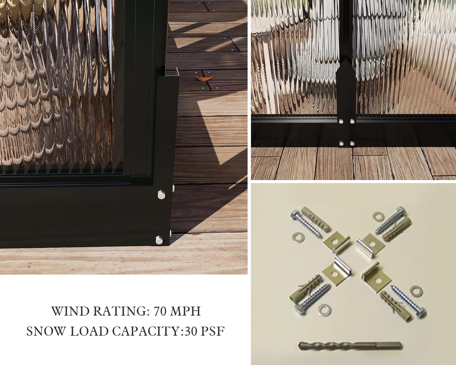 • Reinforced Windproof Firmware: 4 corner posts & 2 middle posts, equipped with strenghtened expansion screws, bury winter greenhouse kits deep in soil or concrete for added stability. Wind Rating: 70 mph; Snow Load Capacity:30 psf