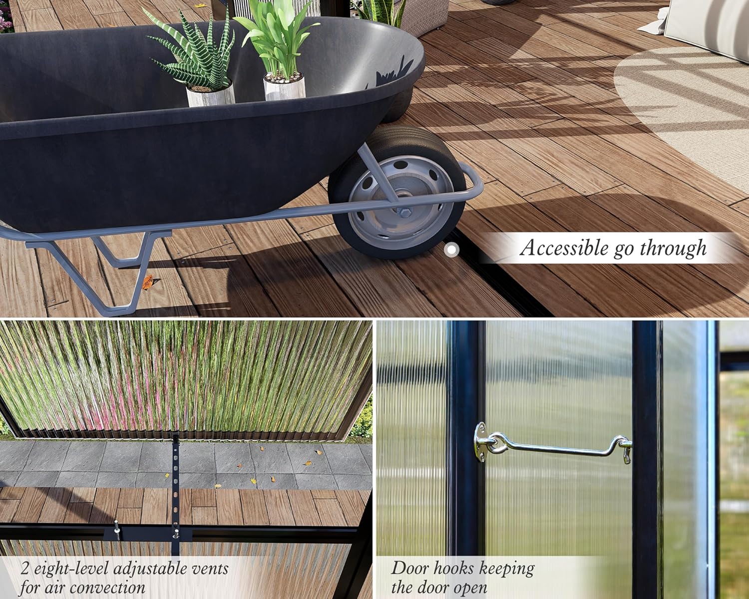 • Walk-in Greenhouse for Better Ventilation: 2 wide swing doors (with door hooks) for easy entry to machineries and people. 2 eight-level adjustable side vents for air convection to manage excess moisture of the backyard greenhouse
