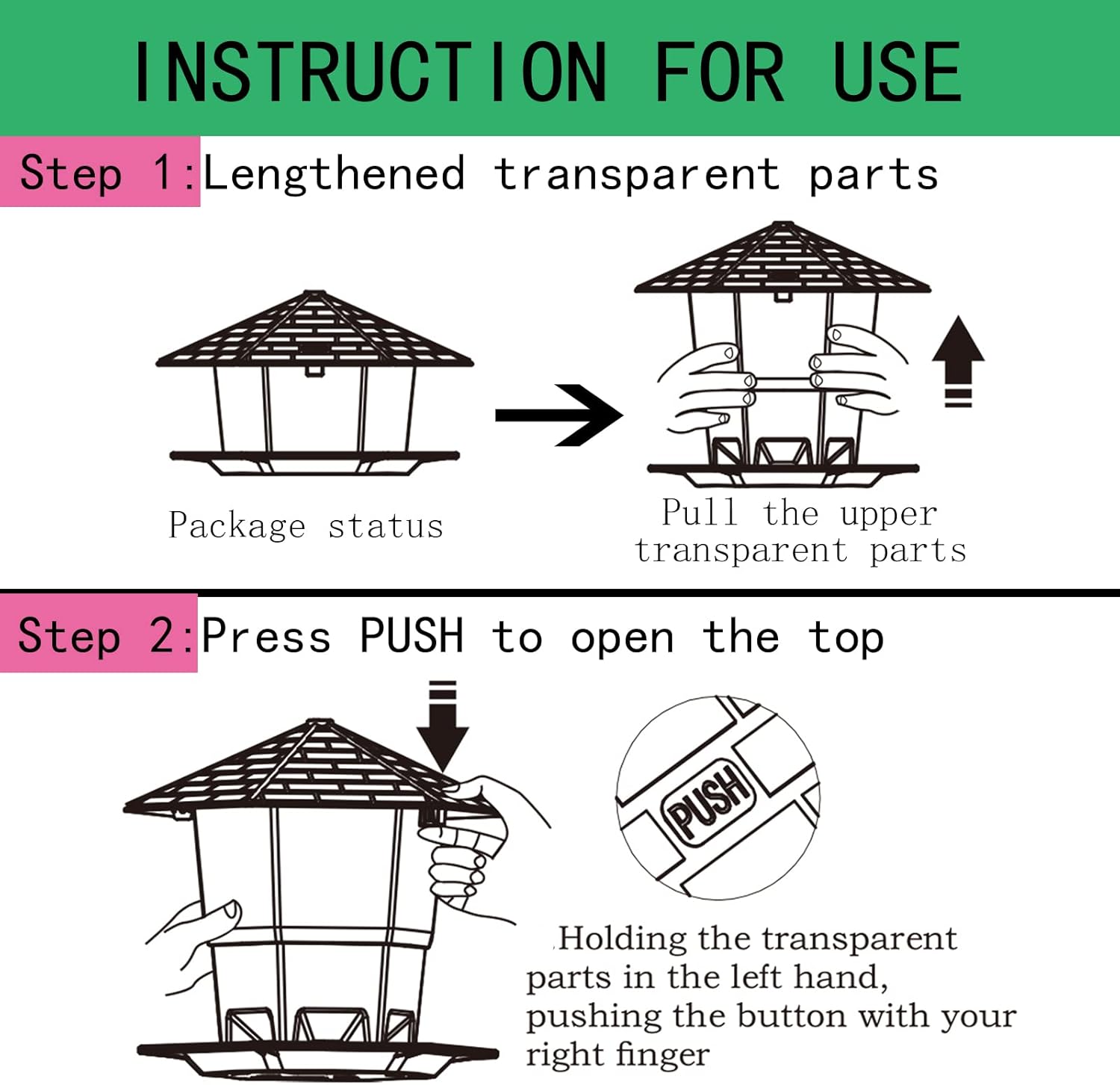 • 【SCENES TO BE USED】Press PUSH to open the lid, put the wild bird seeds, sunflower seeds for birds , safflower bird seed etc, into the bird feeder, close the lid, and then hang the bird feeder under the eaves or in the garden.