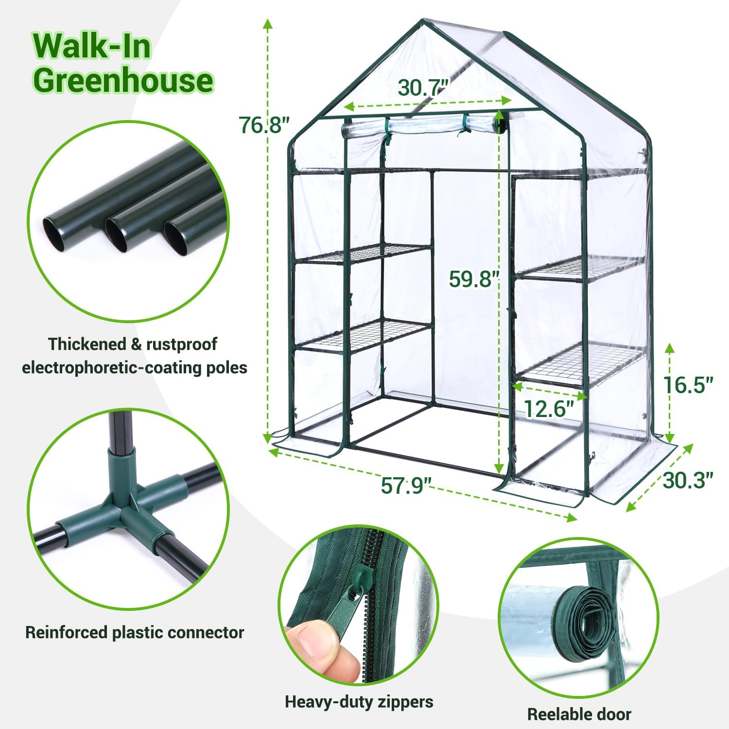 • Heavy-Duty PVC Cover: The small greenhouse features a reinforced PVC cover with double-stitched seams for extra durability and tear resistance. The 6.4-ft high structure and the large roll-up door with high-quality zippers allow for easy access and convenient care of your beloved plants