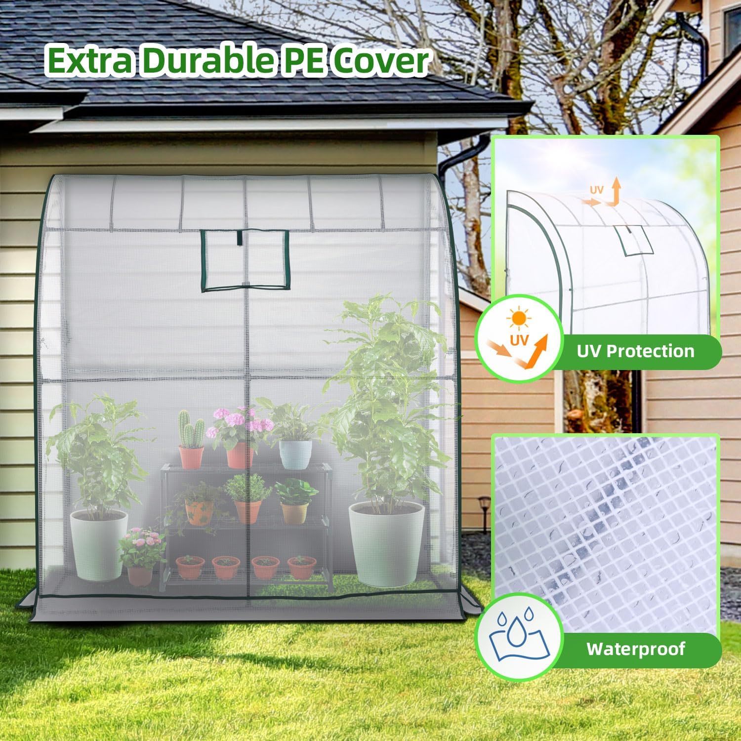 • Lean to Greenhouse: The spacious walk-in greenhouse measures 6.56x3.28x7.05 ft and can conveniently lean on your house wall, barn, garage, or fence for enhanced space utilization. Perfect for an outdoor greenhouse experience