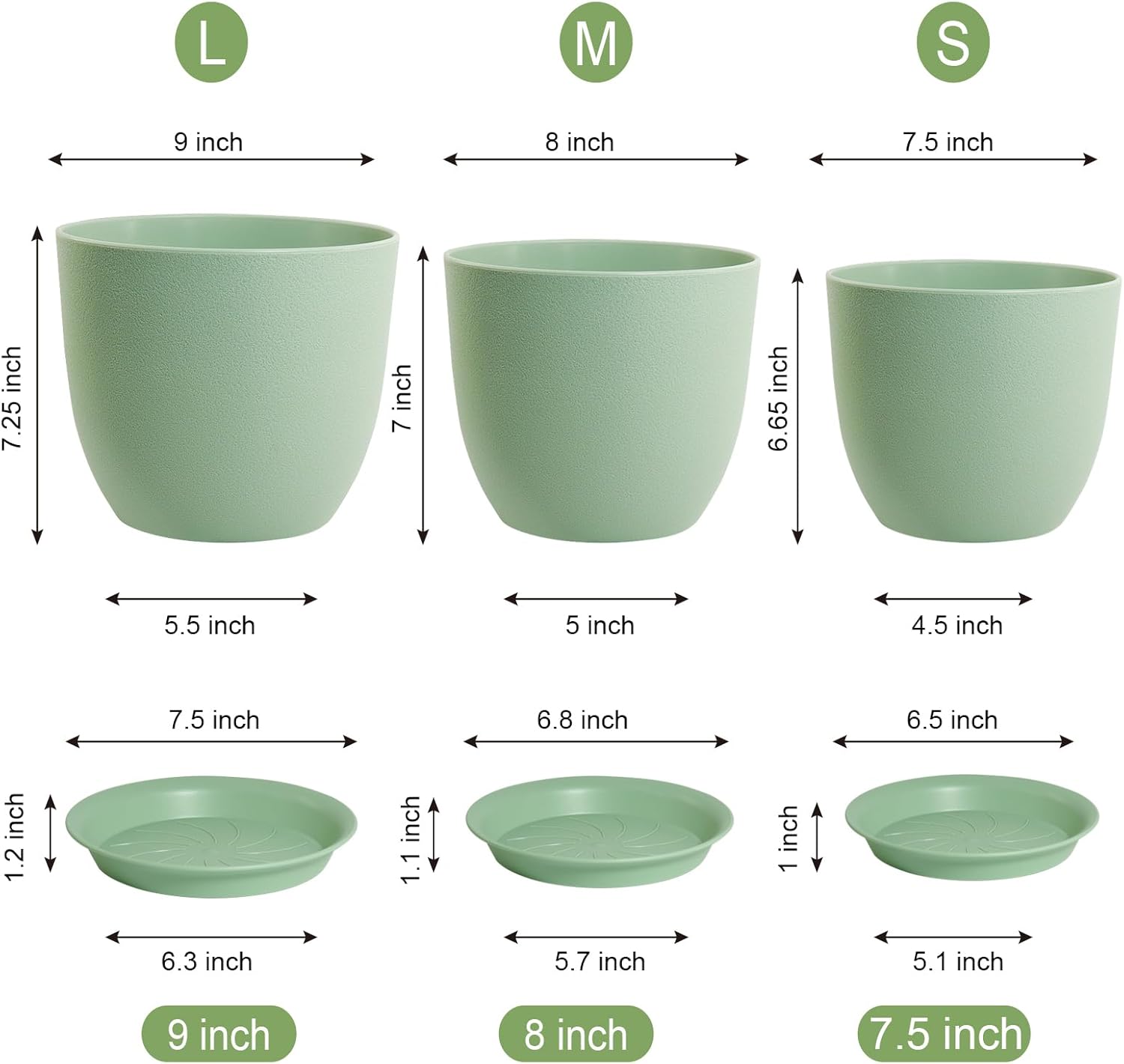 Modern Plant Pots Set, 9/8/7.5 inch Plastic Planters for Indoor Plants, Stylish Flower Pots with Drainage Holes and Saucers for House Plants and Flowers, Green