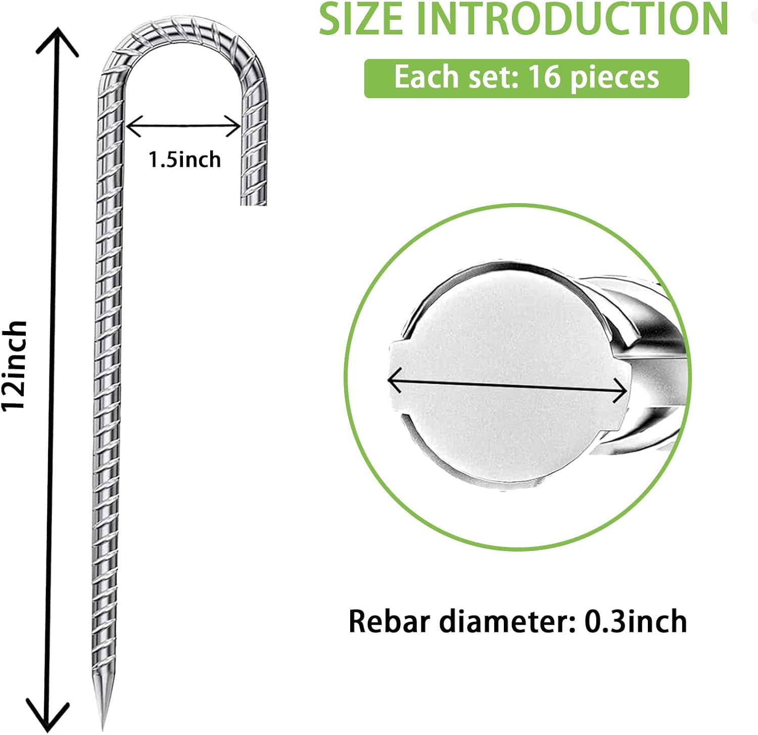 J-Hook-Rebar-Stakes-12-Inch-16-Pack, Ground Stakes Heavy Duty for High Winds Galvanized Anti-Rust Metal Stakes for Ground Heavy Duty Ground Anchors for Garden Dog Fence Chicken Coop Water Pipe