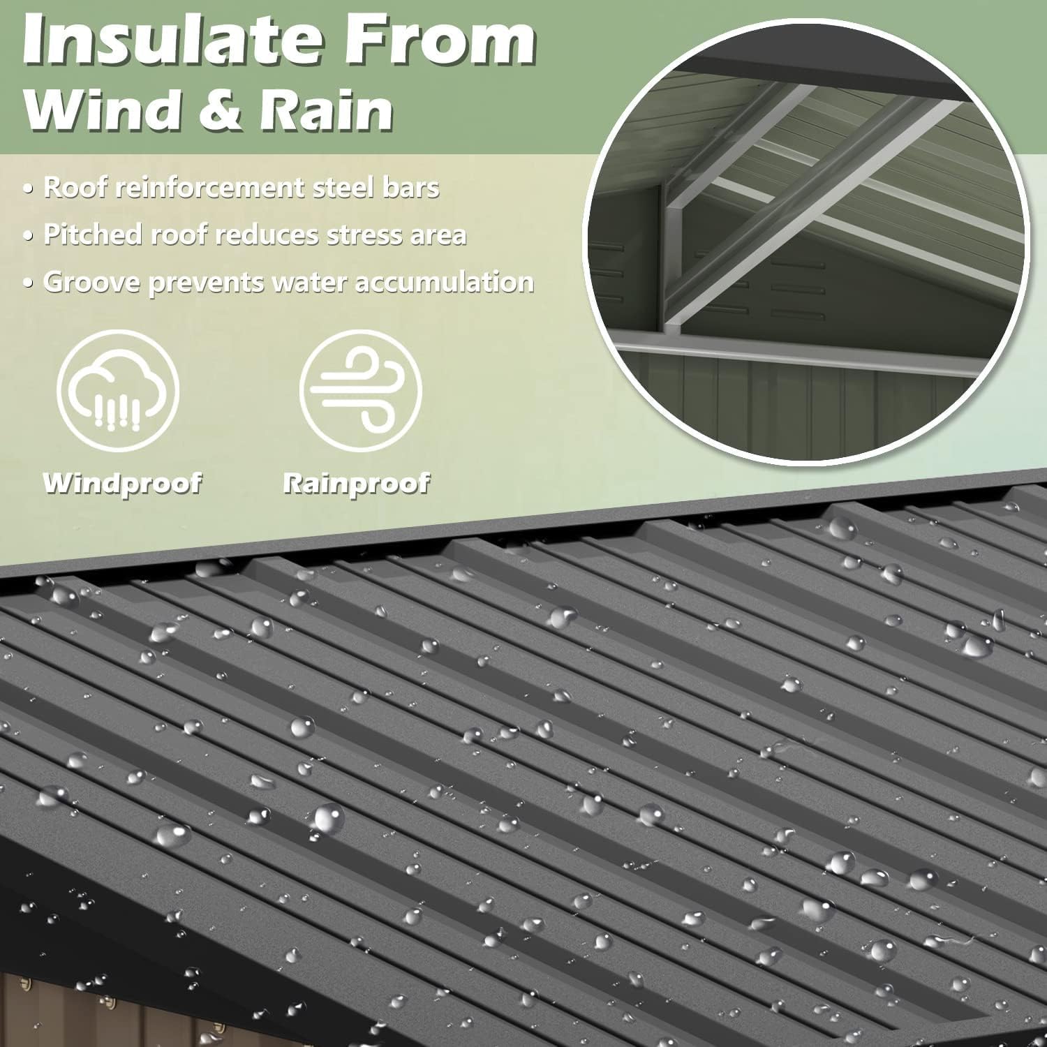• [ Safety and Durability ]: Metal shed's pitched roof effectively prevents rainwater accumulation, while the equipped door lock ensures security. What's more, the equipped ventilation openings also allow for better air circulation.