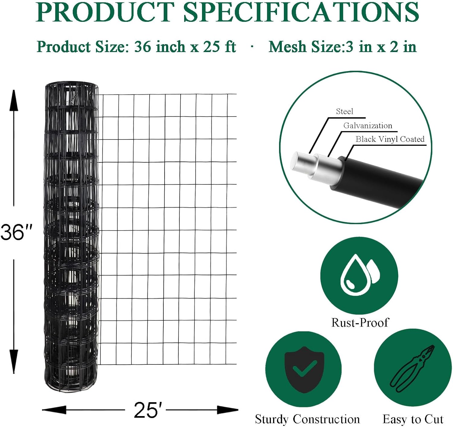 • The inner wire diameter is 16 gauge (1.5mm), after vinyl coating 1.9mm. Mesh size 2"x3". Measures 36 inches in height and 25 feet in length. Black color.