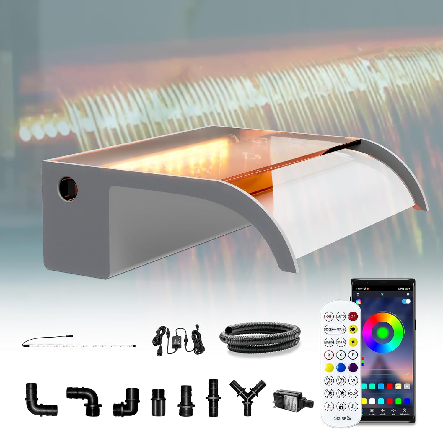 Waterfall Pool Fountain, LONGRUN Acrylic Waterfall Spillway for Pools and Ponds - 11.8" Wide Decorative Water Feature for Swimming Pools, Koi Ponds, and Garden