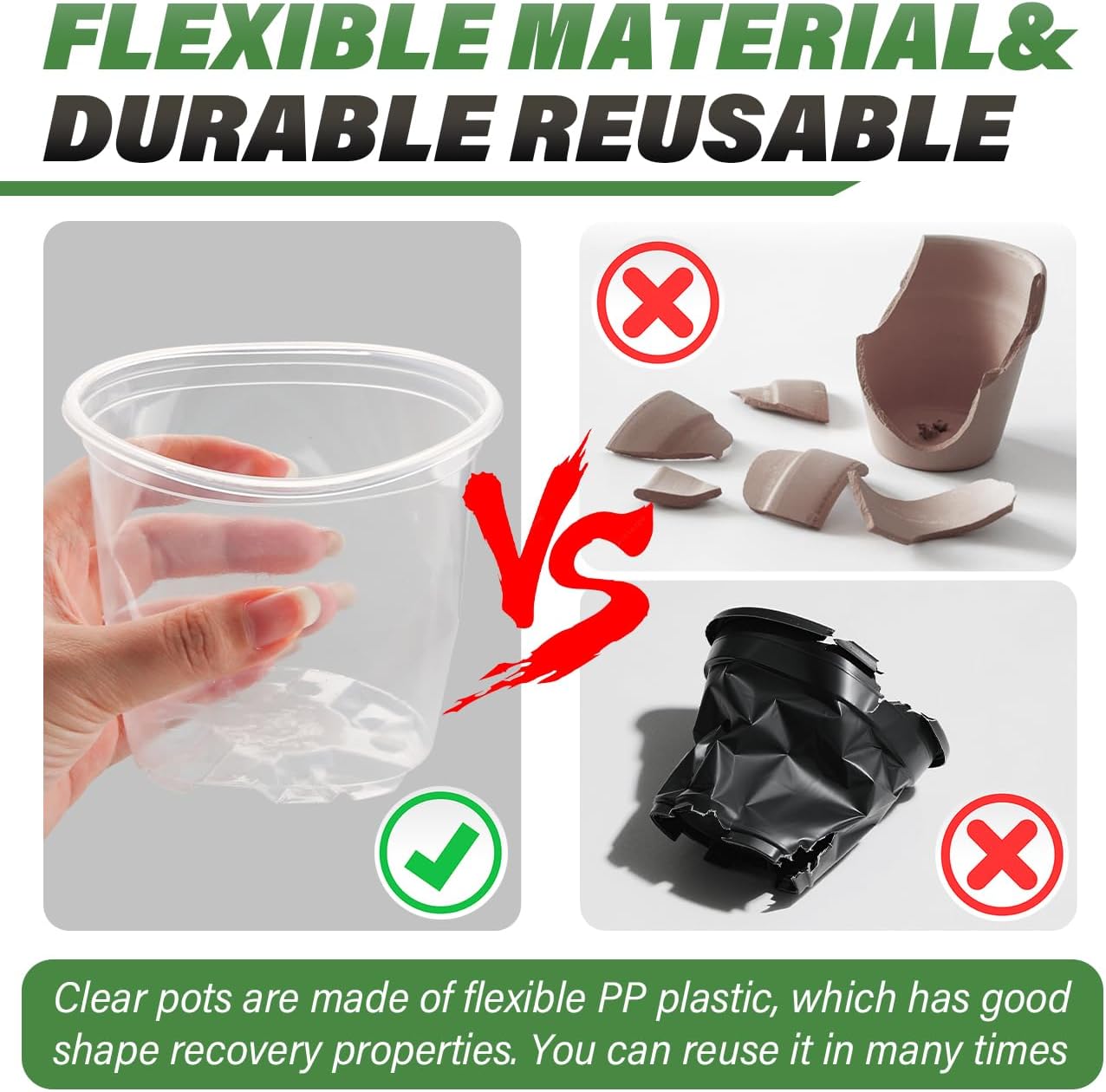 • 【Quality Plastic】3.5 Inch clear plant pots made of top grade plastic, no recycle material added, small plant pots can be repeat use for many times. The edge of the clear nursery pots are sturdy enough for you to carry pots by one hand, two fingers.