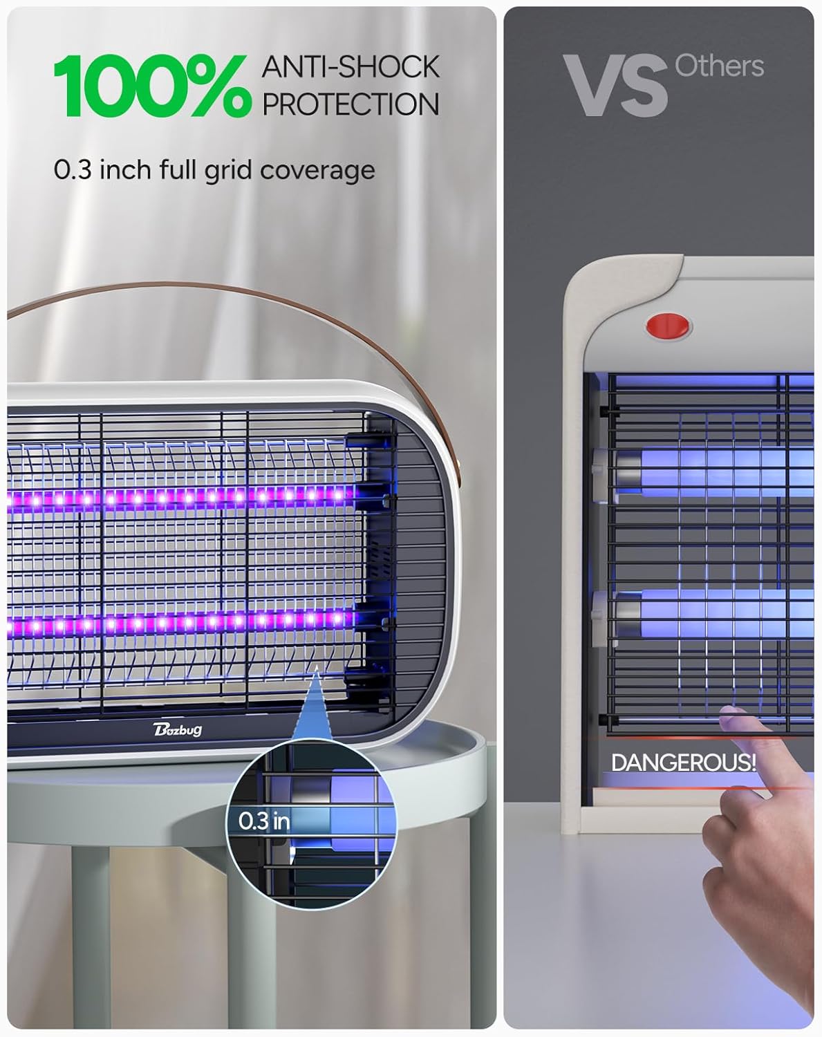 • 360° All-round Protection: There is a dense protective net on the outside of the product to prevent fingers from entering the inside of the device. ABS insulated plastic case to prevent electric shock. The product kills insects physically and emits no odors or smoke. There is a power switch on the right side of the zapper, which can easily cut off the power.