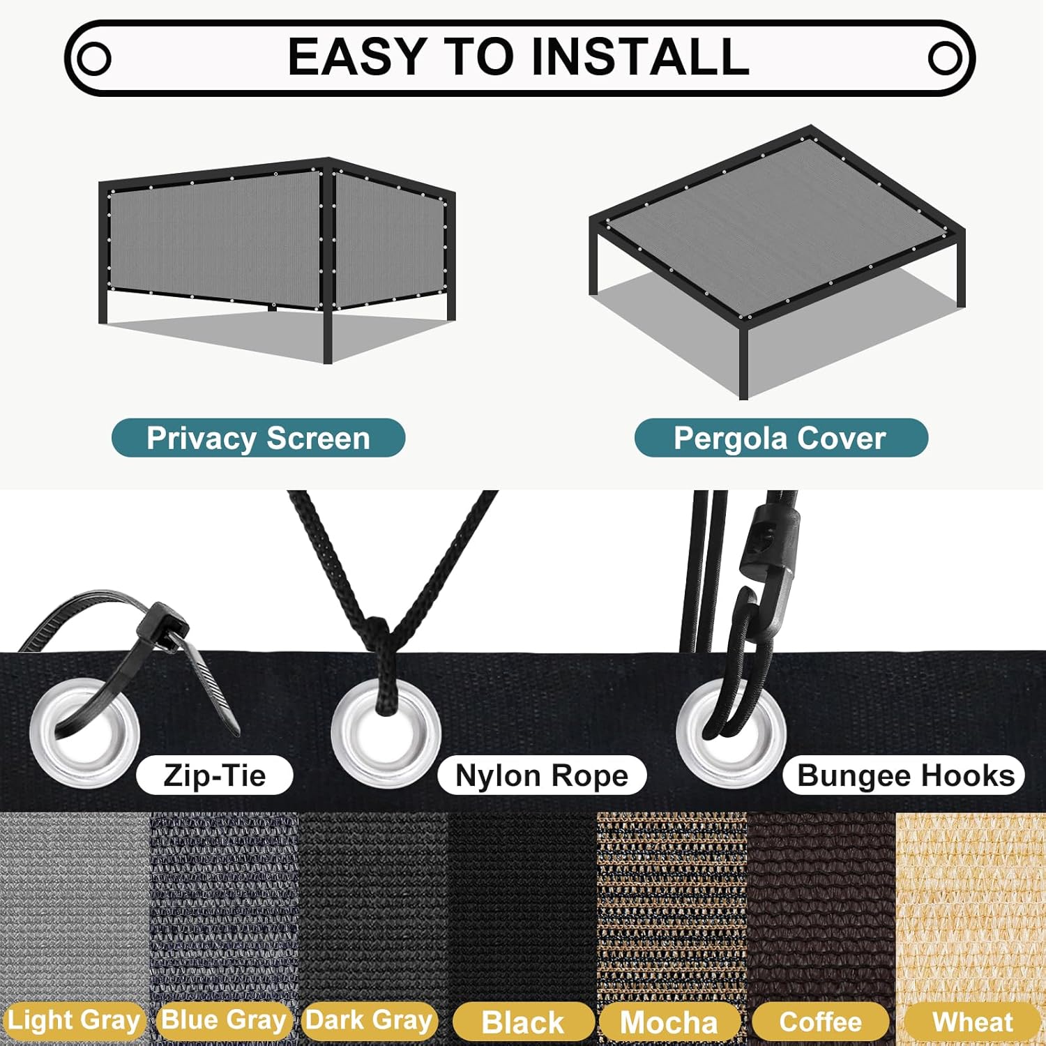 • Accessory Updated: Accessories have been updated from [Zip-ties, Ropes, Bungee Balls] to [Zip-ties, Ropes, Bungee Hooks]. Both versions are in circulation and will be shipped randomly. Easy to Install: With included grommets on each sides every 2 ft space and fixing accessories, you can easily attach the pergola shade cover to various structures while ensuring uniform stress. Whether you're looking to cover your backyard, carport, or playground, you can have it up and providing shade in no time