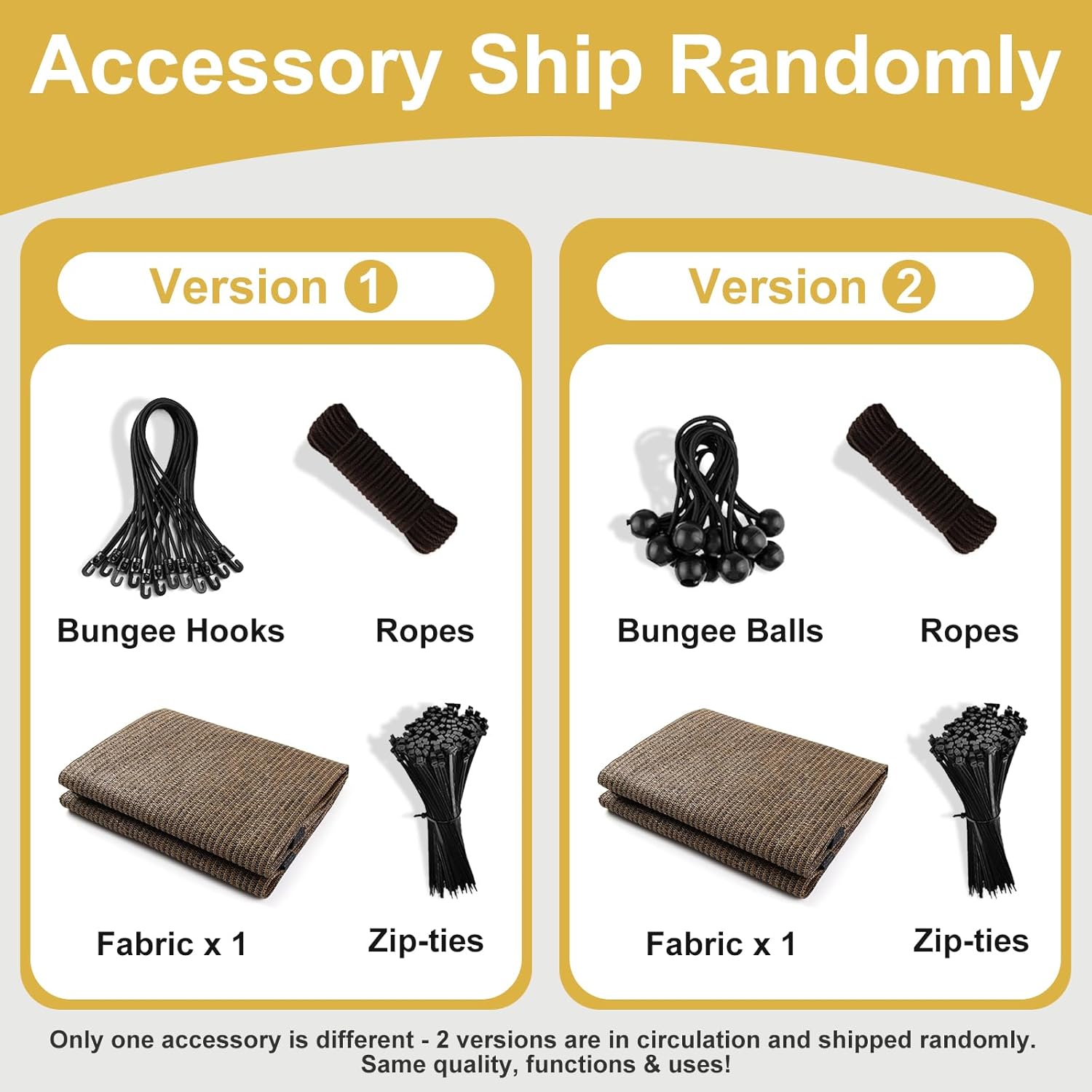• Accessory Updated: Accessories have been updated from [Zip-ties, Ropes, Bungee Balls] to [Zip-ties, Ropes, Bungee Hooks]. Both versions are in circulation and will be shipped randomly. Easy to Install: With included grommets on each sides every 2 ft space and fixing accessories, you can easily attach the pergola shade cover to various structures while ensuring uniform stress. Whether you're looking to cover your backyard, carport, or playground, you can have it up and providing shade in no time