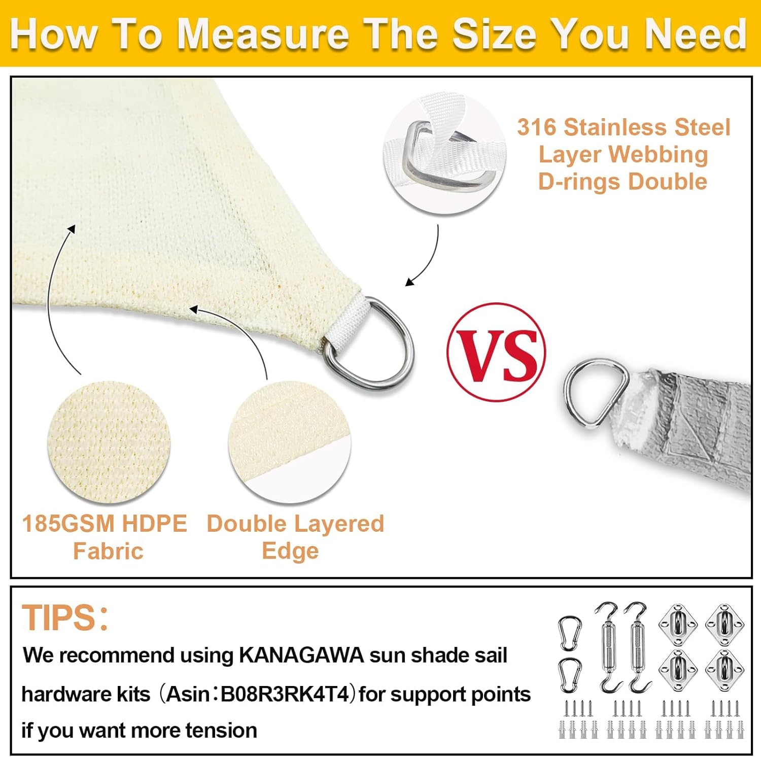 • ★【Curve Edge Design】:Kanagawa shade sails have the curves in the edges to set up tension through the sail. As the corners of the sail are tensioned, the edge curves try to straighten, in turn pulling the fabric tight. This design not only improve the pull strength, but also effectively prevent the shade sail from drooping.