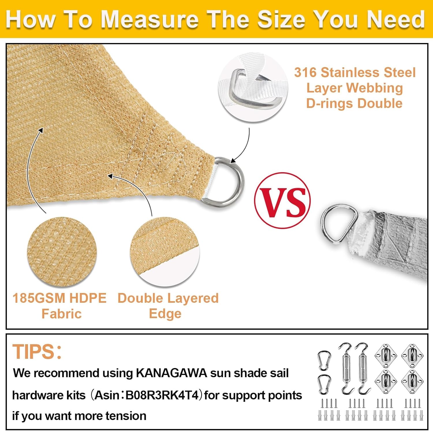 • High Quality Materials: Made of 100% brand new 185 GSM HDPE (high density polyethylene) material.Our sunshade sail is attached with DOUBLE layer webbing in each side and stainless steel D rings in corners to make the sun sail shades stronger and more durable
