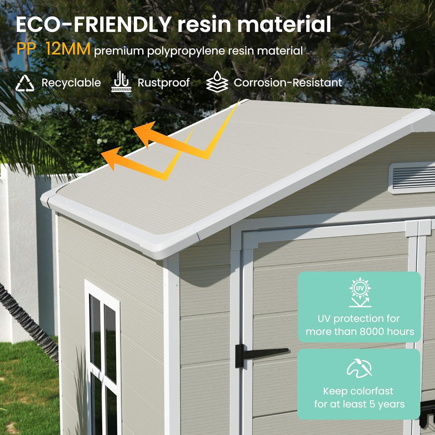 • RECYCLABLE RESIN MATERIAL:Our storage shed is crafted with 12 MM premium polypropylene resin plastic, which is recyclable. Resin shed is corrosion-resistant, waterproof, rustproof and with UV protection for more than 8000 hours, less bending and puncturing, worry-free for use in all weather conditions. It can be used daily for five years without fading