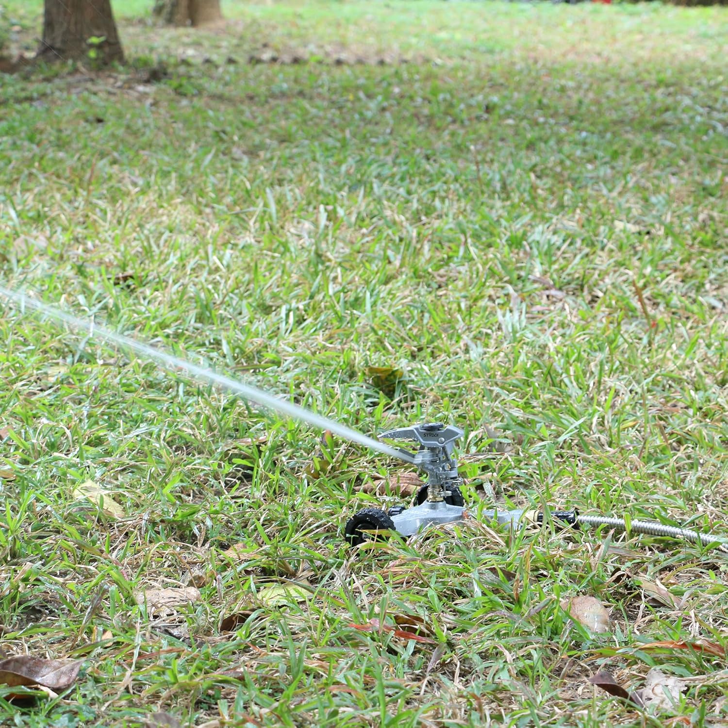 • ALL METAL CONSTRUCTION TO KEEP STABLE - The construction of this impact sprinkler has been upgraded to be all metal making, which is heavy-weight enough to keep the sprinkler in position without rollover when working. Metal is also rust and corrosion resistant, ensuring durability and long-term use. The two large wheels are made of hard plastic that can withstand severe weather conditions and long time exposure.