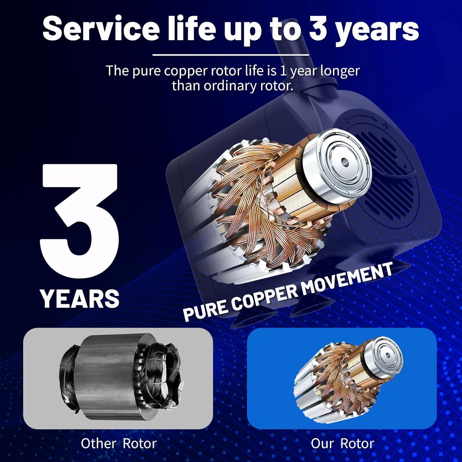 • 【ULTRA-QUIET DESIGN & LONG LIFE】In order to keep the pump quiet and have a longer life, increased the cost by using high quality rotor and copper,make the pump quiet & long life.