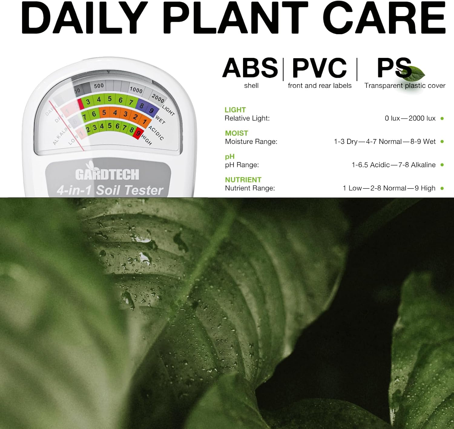 • 🌻【4-in-1 Multi-Function】- This soil meter for plants can meet your needs to measure soil moisture, Ph, nutrients, and light conditions at the same time. The 4-in-1 soil moisture meter indoor plants is much more cost-effective than traditional single-function soil testers, and you only need to buy one to enjoy all four services. It helps you to fully understand your plants.