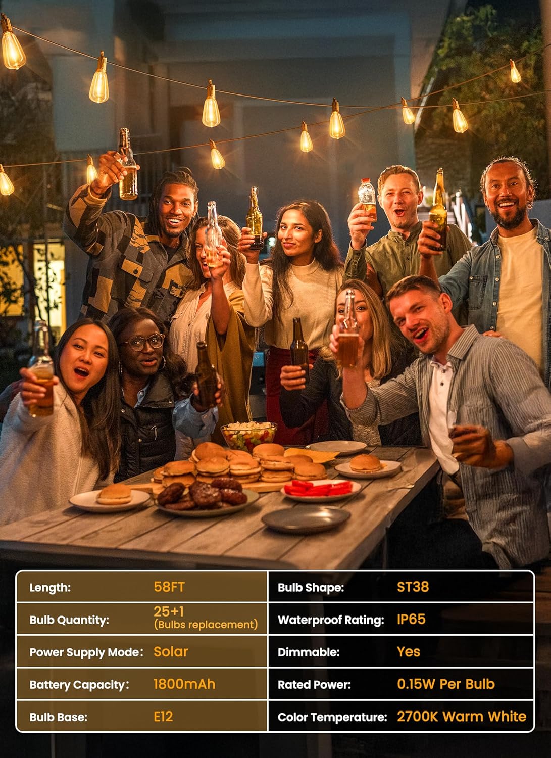 • 【Weatherproof & Elegant Romantic Glow】Brightown outdoor solar lights string use vintage Edison bulbs, solar and USB charging available, install this hanging lights string as a canopy over your porch or gazebo for a retro bistro look and a pleasant party ambience; Make your space to be an enticing, relaxing and soothing retreat with our LED outdoor lights. They last 8-10 hours on a full charge, i.e. 10 hours of direct sunlight or 5 hours of USB charging.