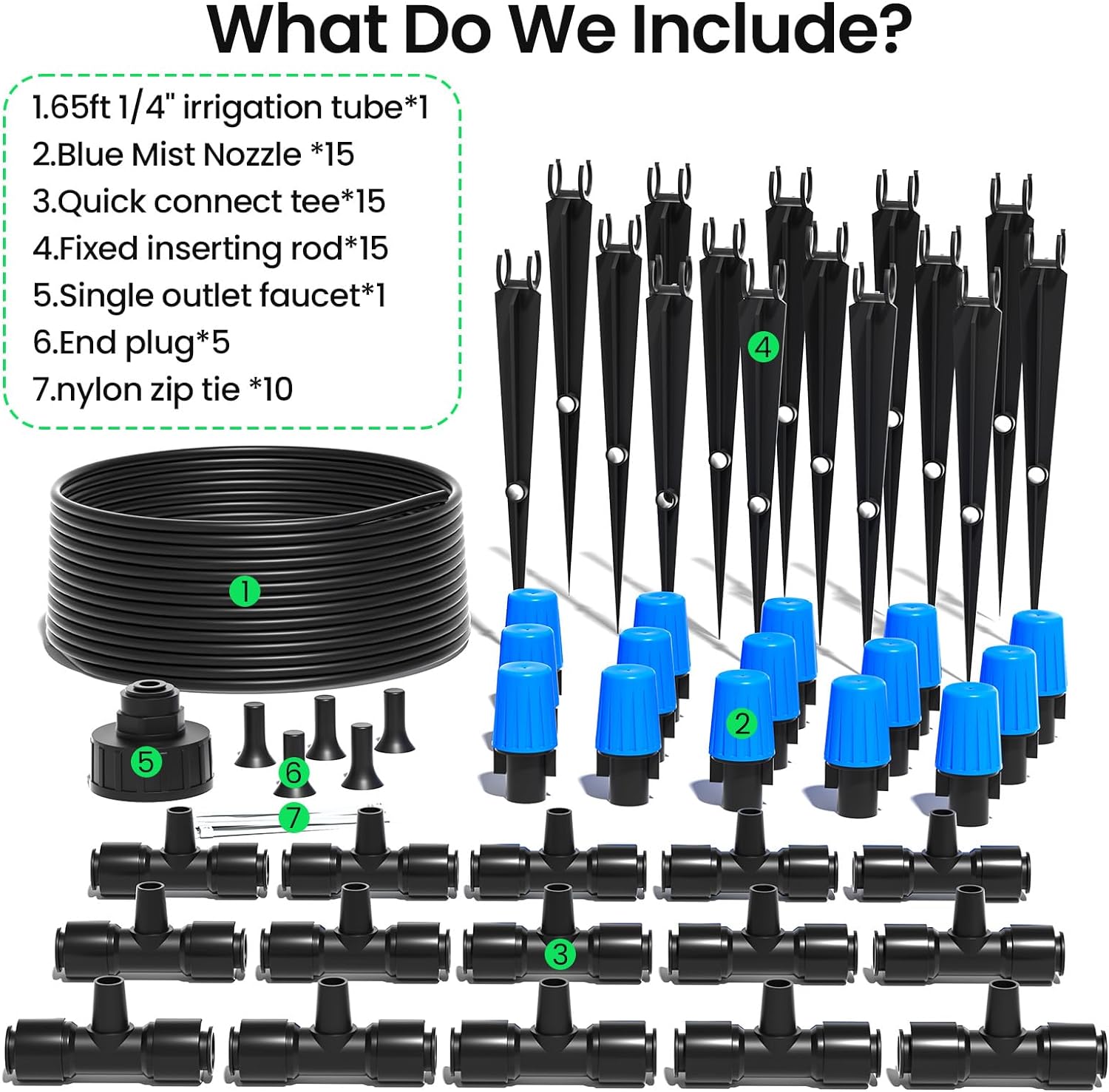 • [Advanced Misting Watering System]The MIXC Misting Watering System kit offers top-notch features for convenient and efficient plant care. Each kit includes:100ft 1/4'' irrigation tube*1,Blue Mist Nozzle *15,Quick connector tee*15,Fixed inserting rod*15,Single outlet faucet*1,End plug*5,Nylon zip tie *10