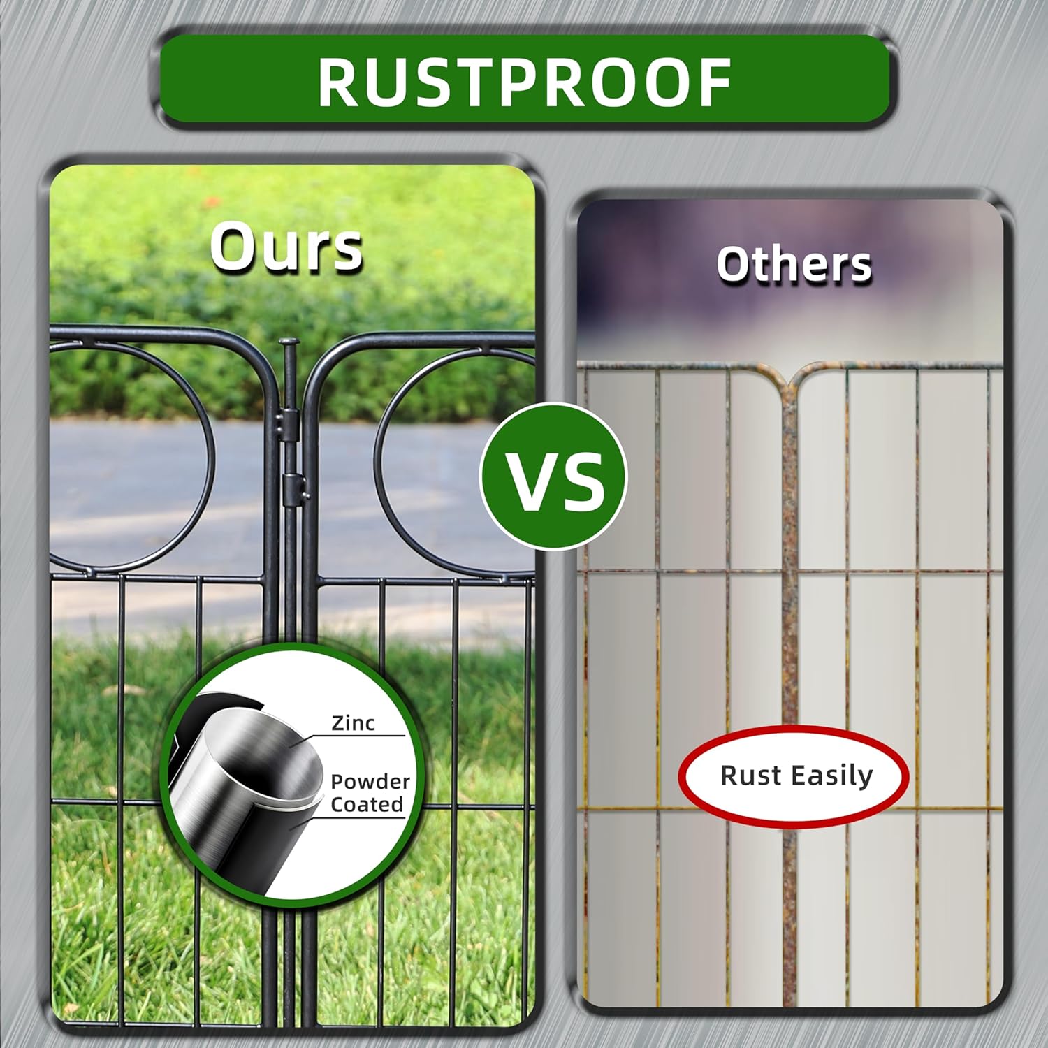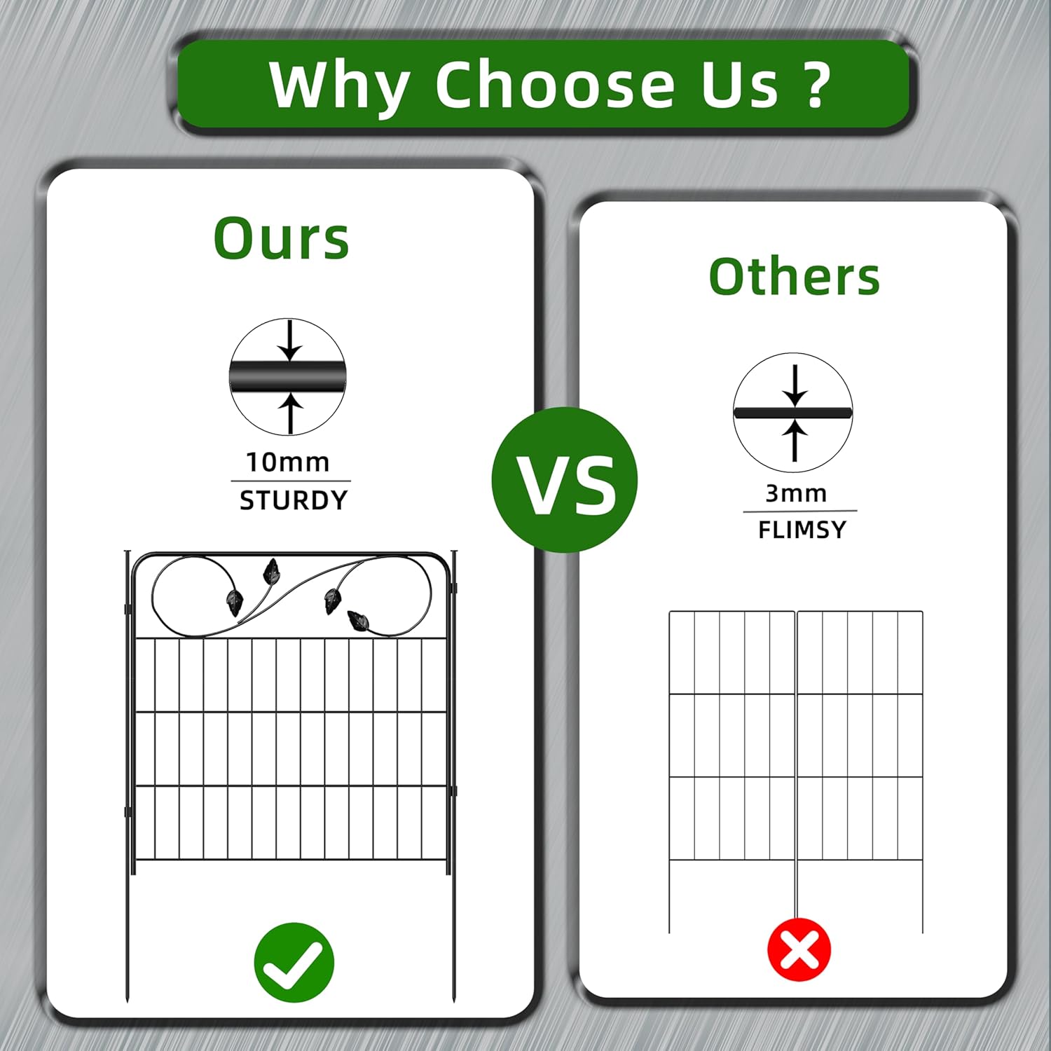 • STURDY STRUCTURE: The metal garden border fence panel made of thick iron tube frame and welded by thick iron wires, The stakes are 8mm diameter. The garden fencing for black color powder coated surface outside for rustproof material, Which are very sturdy and safe for decorating the yards.