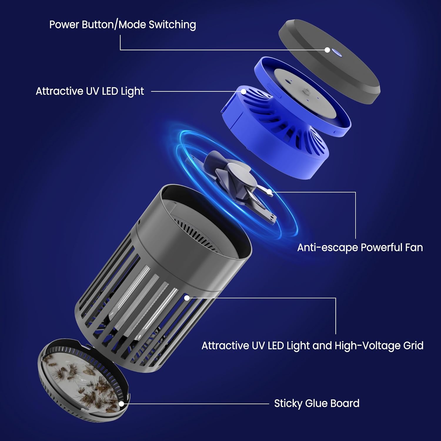 • 3-in-1 device : Features 3 powerful modes for effective pest control. Mode 1 (1 press): Fan + Sticky Paper—top UV light attracts bugs, fan sucks them into the bottom trap (requires included sticky paper). Mode 2 (2 presses): Electric Zapper—middle light lures insects, high-voltage grid eliminates them instantly. Mode 3 (3 presses): Dual Action—both lights, fan, and zapper work together for max coverage and efficiency. Note: Always use sticky paper in fan-involved modes to trap bugs securely.