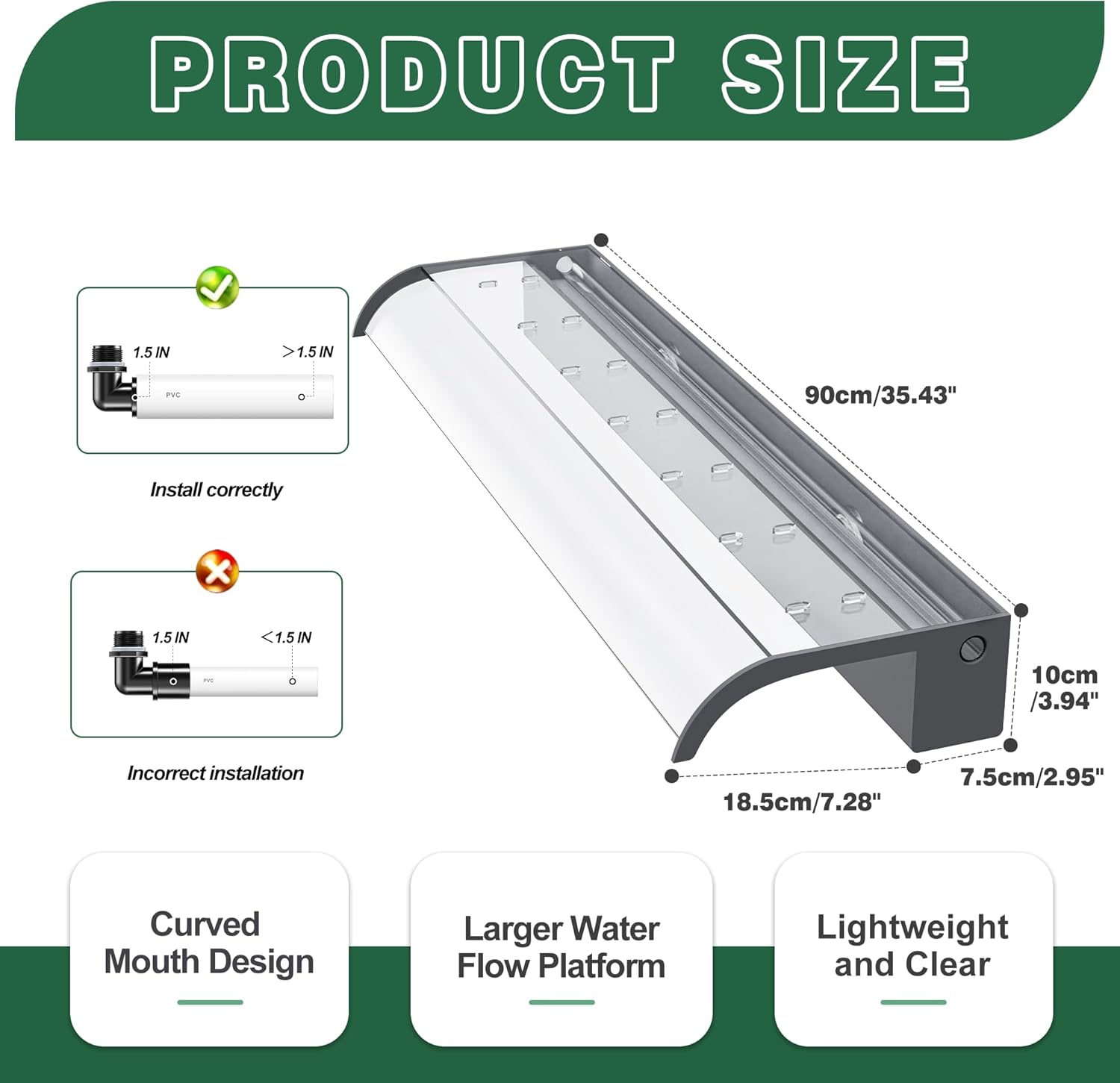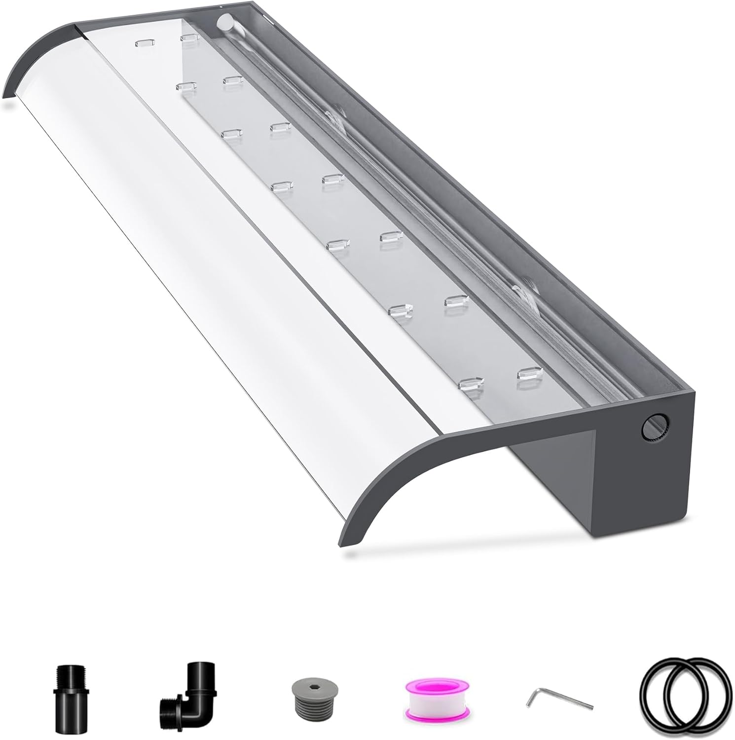 • 【Updated Curved Open Lip】- Unlike other narrow, short waterfalls, our updated pond waterfall features an integrated 8-inch wide water platform and 4-inch high water storage tank platform, and curved open lip. This wider, longer design creates a stable, smooth stunning water flow, so you can better enjoy the soothing sights and sounds of the cascading water. Waterfall does not include LED lights. Purchase them in our store.