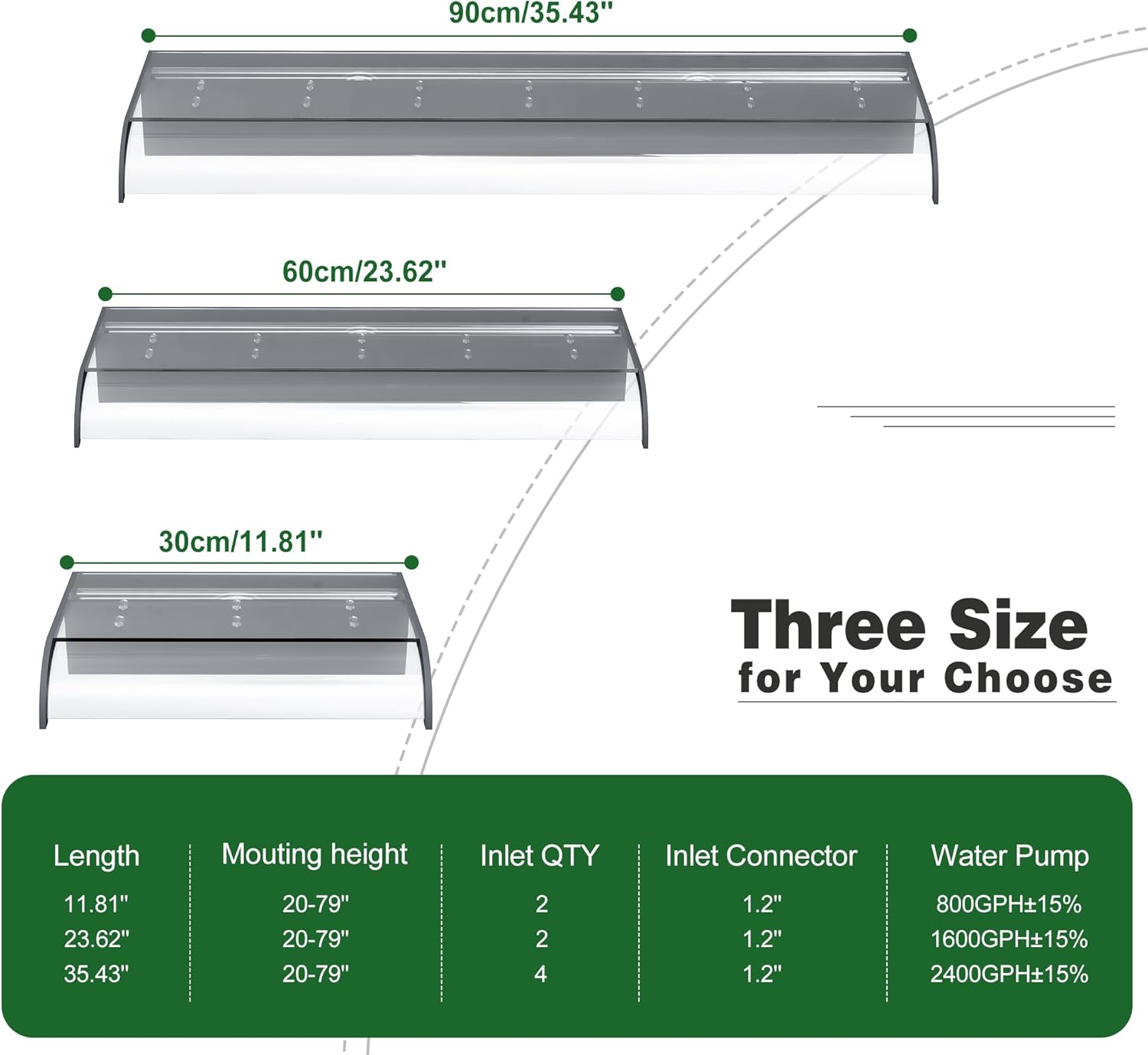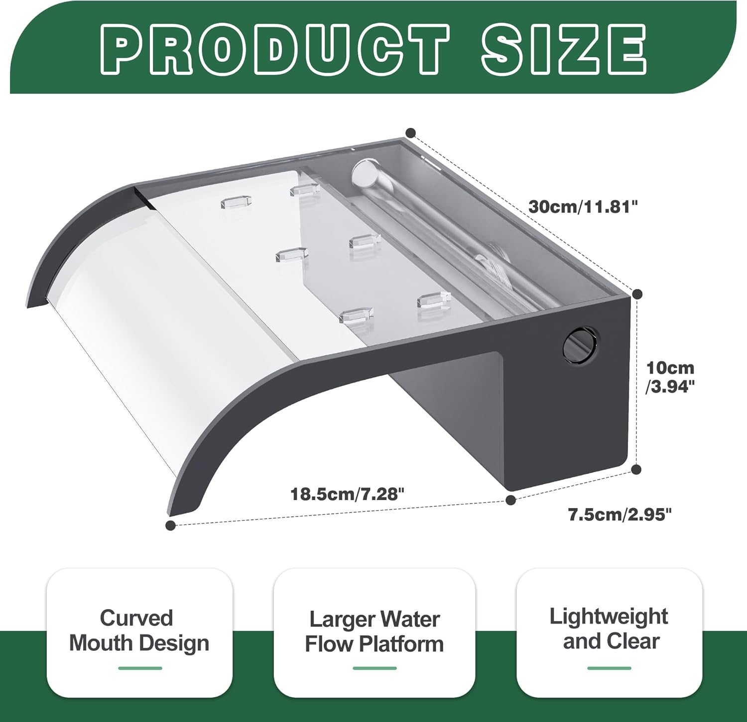 • 【Updated Curved Open Lip】- Unlike other narrow, short waterfalls, our updated pond waterfall features an integrated 8-inch wide water platform and 4-inch high water storage tank platform, and curved open lip. This wider, longer design creates a stable, smooth stunning water flow, so you can better enjoy the soothing sights and sounds of the cascading water. Waterfall does not include LED lights. Purchase them in our store.
