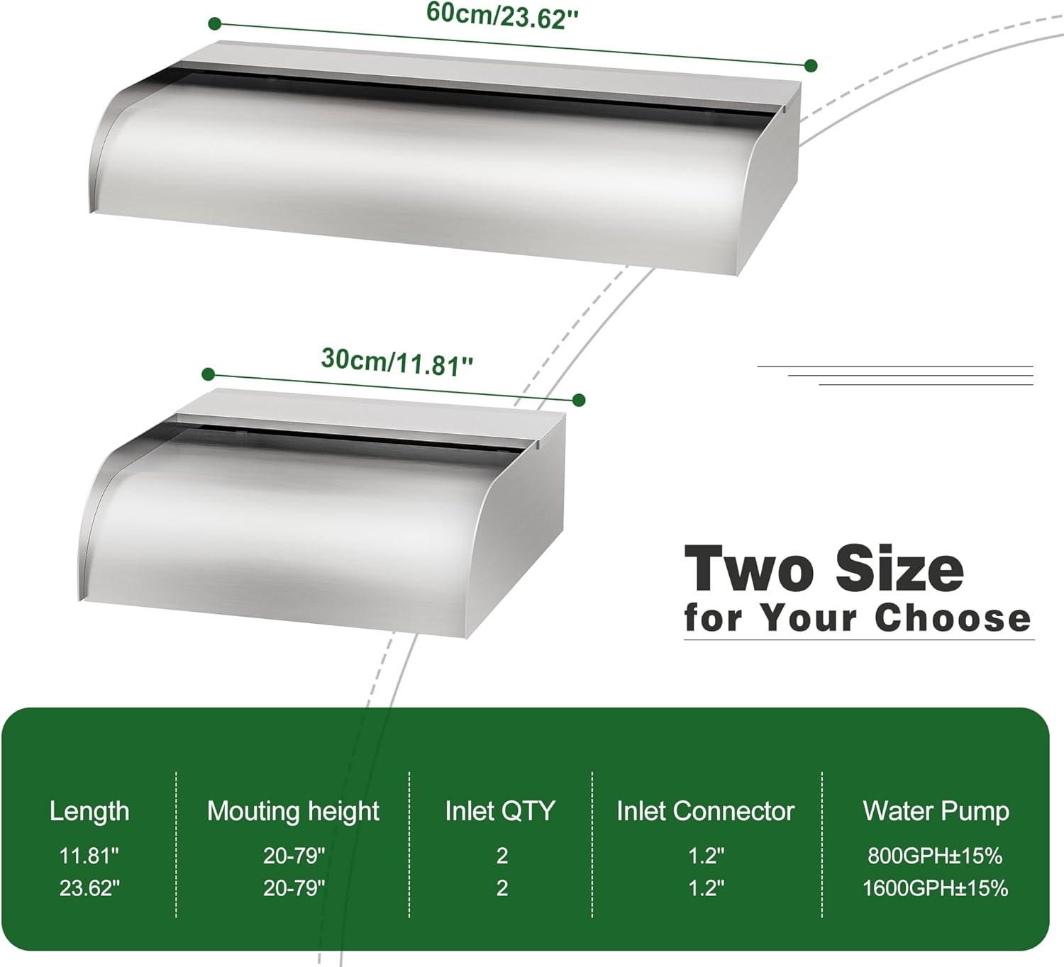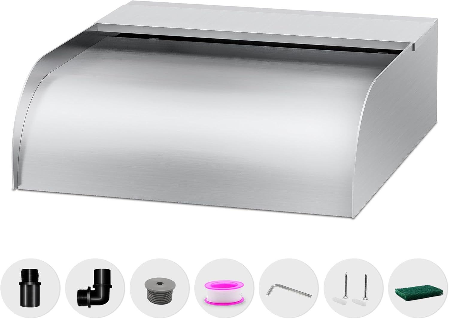 • 【Anti-Rust Spillway Waterfall】- Our welded in one body one-piece 304 stainless steel construction of this spillway waterfall provides long-lasting strength, rust resistance, and leakproof performance. The open lip design creates an elegant freefalling waterfall that adds decorative flair to ponds and pools. The soothing sound of the cascading water promotes relaxation and tranquility. LED light strips not included, but available separately.