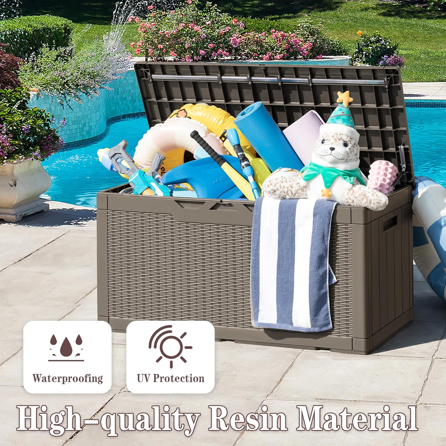Greesum 100 Gallon Resin Deck Box Large Outdoor Storage Boxes with Cushions for Garden Tools, Patio Furniture Pillows, Pool Supplies, Light Coffee