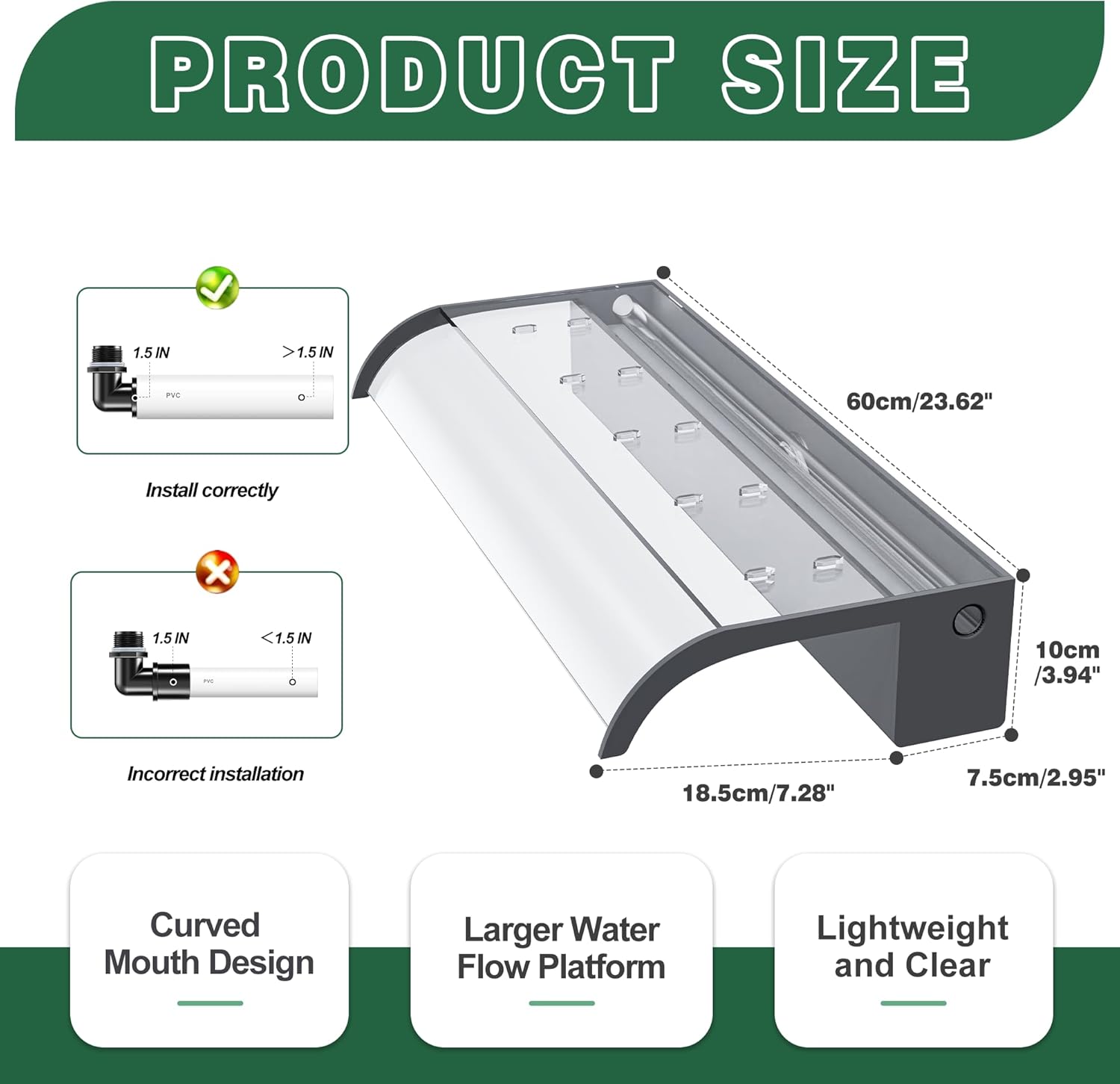 • 【Updated Curved Open Lip】- Unlike other narrow, short waterfalls, our updated pond waterfall features an integrated 8-inch wide water platform and 4-inch high water storage tank platform, and curved open lip. This wider, longer design creates a stable, smooth stunning water flow, so you can better enjoy the soothing sights and sounds of the cascading water. Waterfall does not include LED lights. Purchase them in our store.
