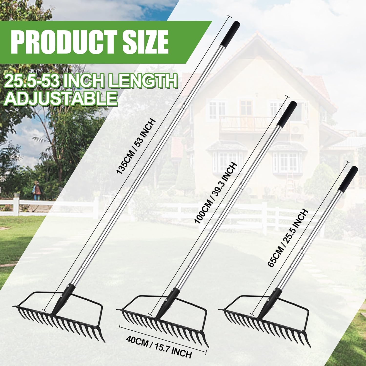 • Adjustable Handle : Lawn leveling rakes have multi-jointed handles that can be adjusted to the desired length by attaching different numbers of poles. This allows you to customize the heavy duty rakes length according to your preference and work requirements, plus it makes it easy to store and carry