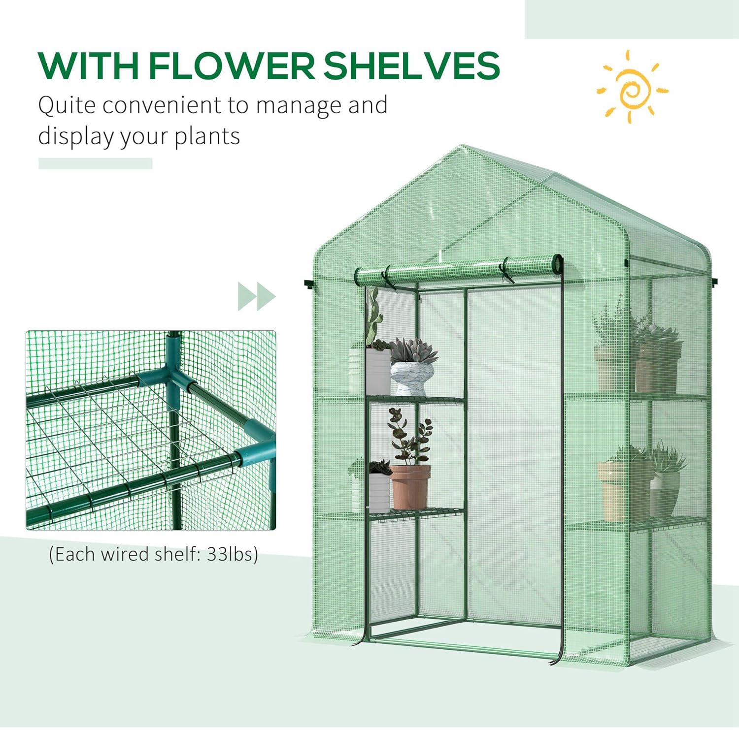 • Outdoor Ready: Our small walk-in green house is constructed with a strong powder-coated steel frame for stability. This gives our greenhouse the strength of steel without worrying about water causing issues.