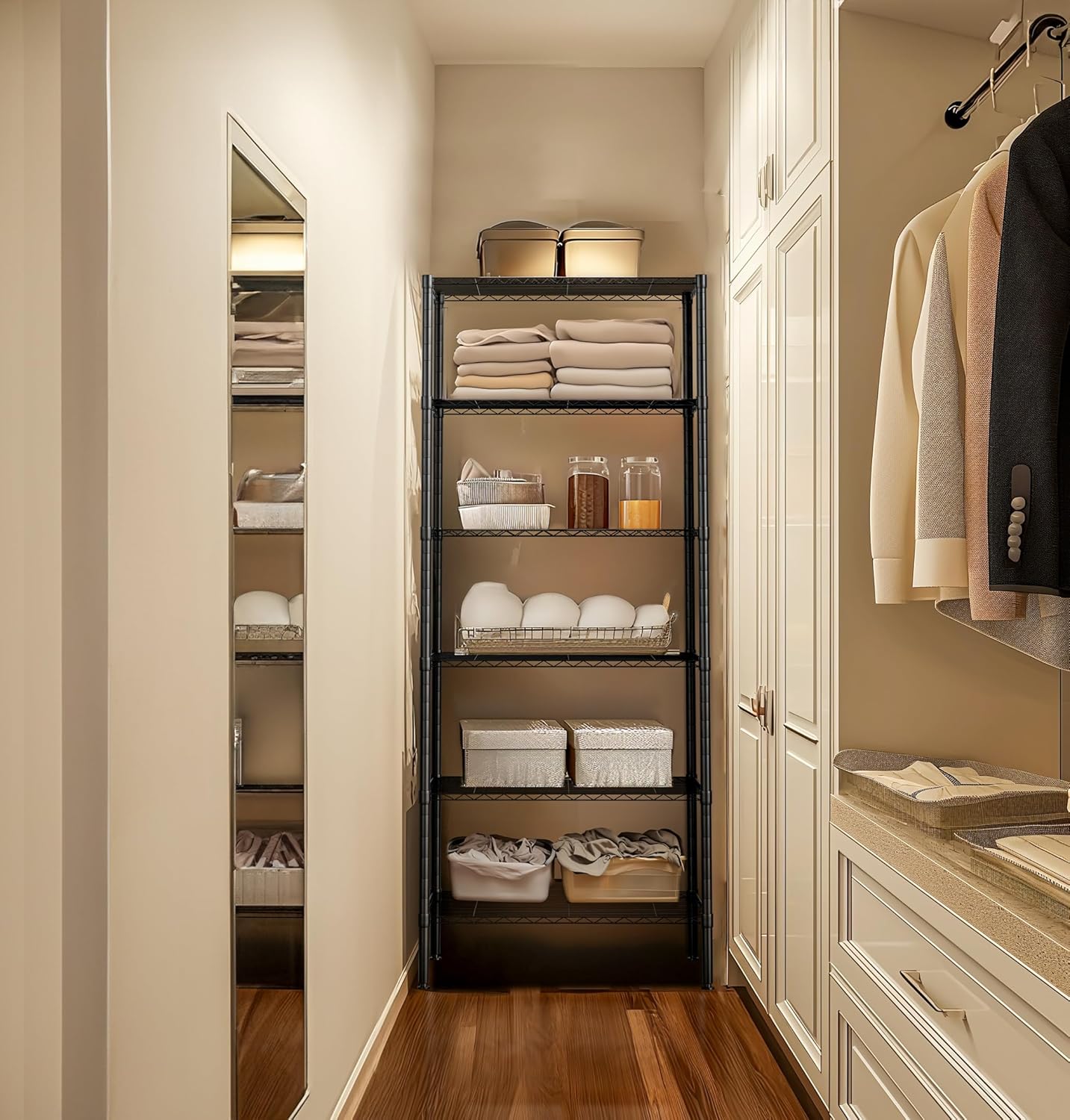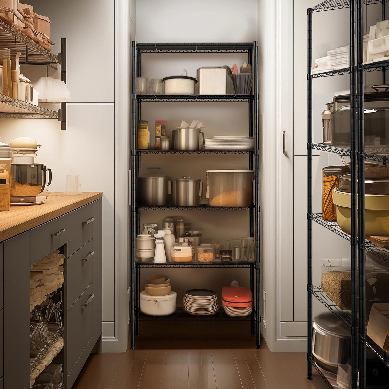 • RELIABLE & STURDY CONSTRUCTION - NSF Certified to ensure the quality. 250 lbs loading capacity per shelf with leving feet (evenly distributed) totally 1500 lbs, perfect for home use. Wire shelves adjustable in 1-inches to meet your different storage needs.