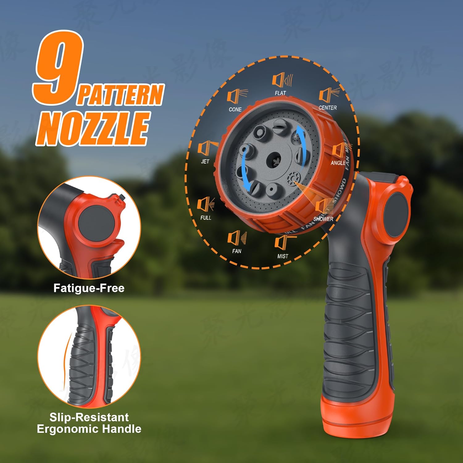 • 【9-Pattern Pro Nozzle】Professional garden hose sprayer with upgraded pressure control delivers 9 targeted modes (Flat/Cone/Jet/Full/Fan/Mist/Shower/Angle/Center).The hose nozzle has been upgraded, allowing you to adjust the water pressure by simply pushing the switch.
