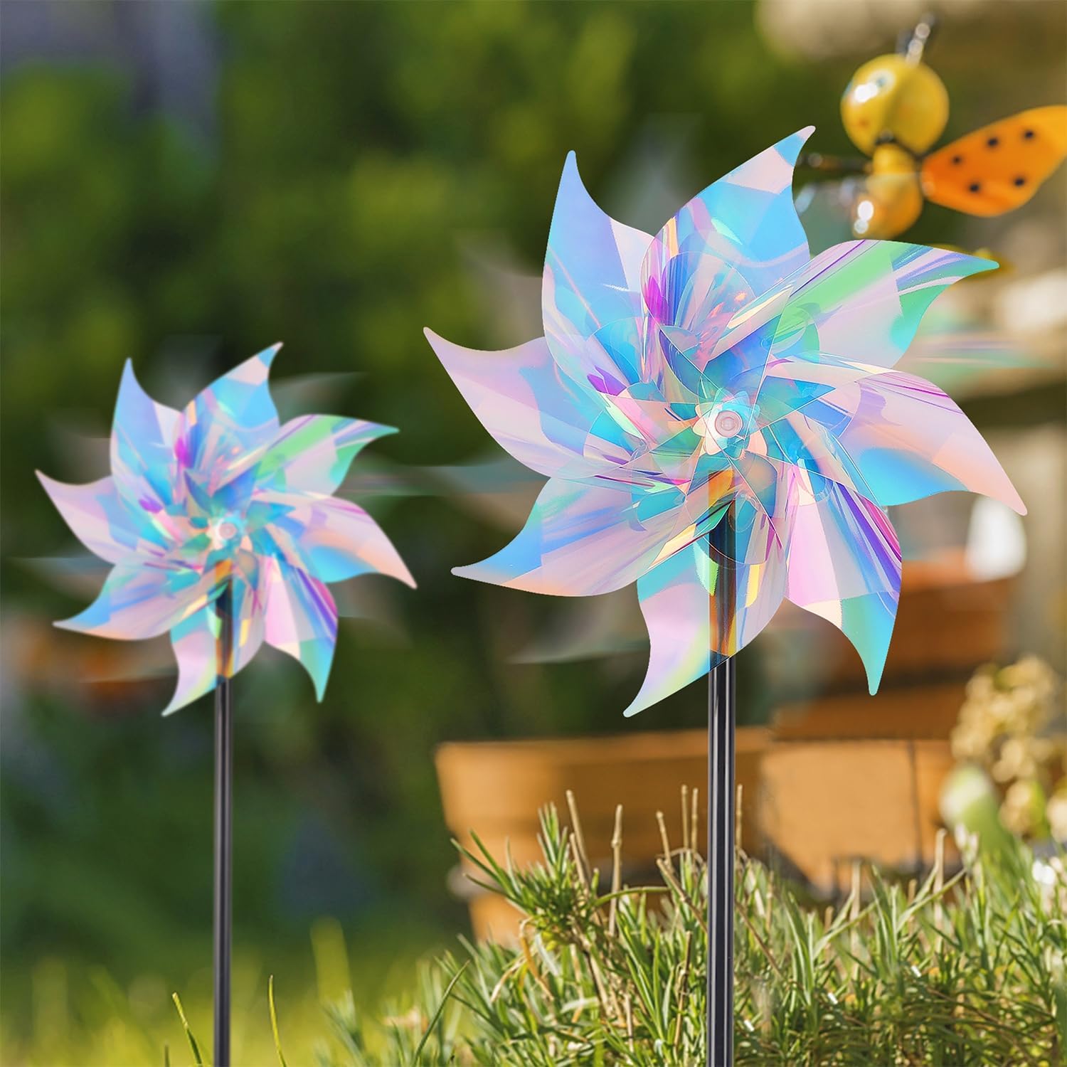• 10 Pack Transparent Rainbow Reflective Pinwheels: Our visual reflective ornamental pinwheel uses wind motion and light reflections to keep birds away coming from any angle. 10 pack shiny reflective Mylar pinwheels can rotate easily in the breeze, protect your garden, farm, and lawn by creating a bright flash that scares away birds
