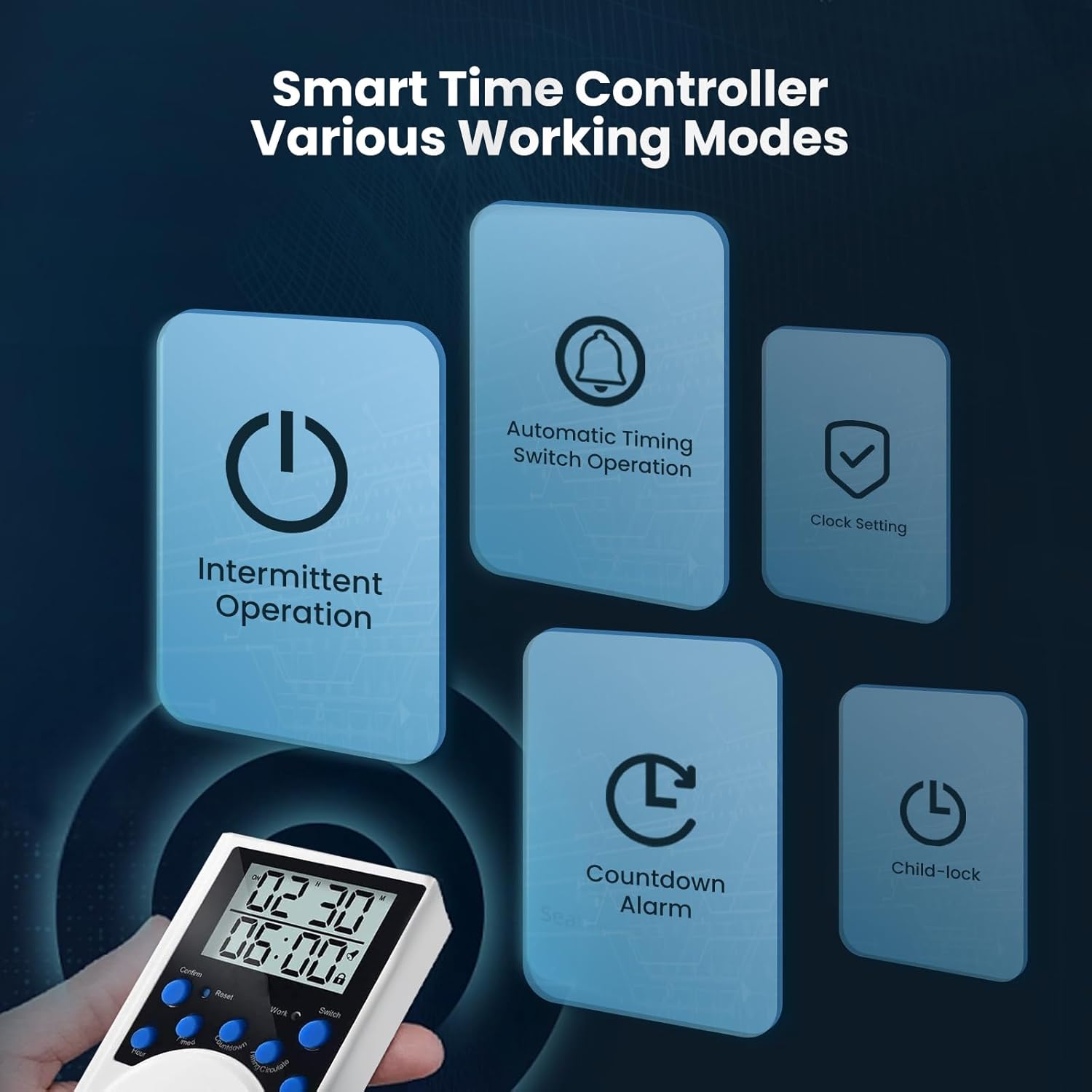 • Multiple Working Modes — Various timing functions could be set for energy efficient via the smart time controller such as automatic timing switch operation, countdown timer alarm, intermittent duty for the pond air pump aerator outdoor. The pond air pump could keep working without using the timer controller by manually turning on the switch after power on