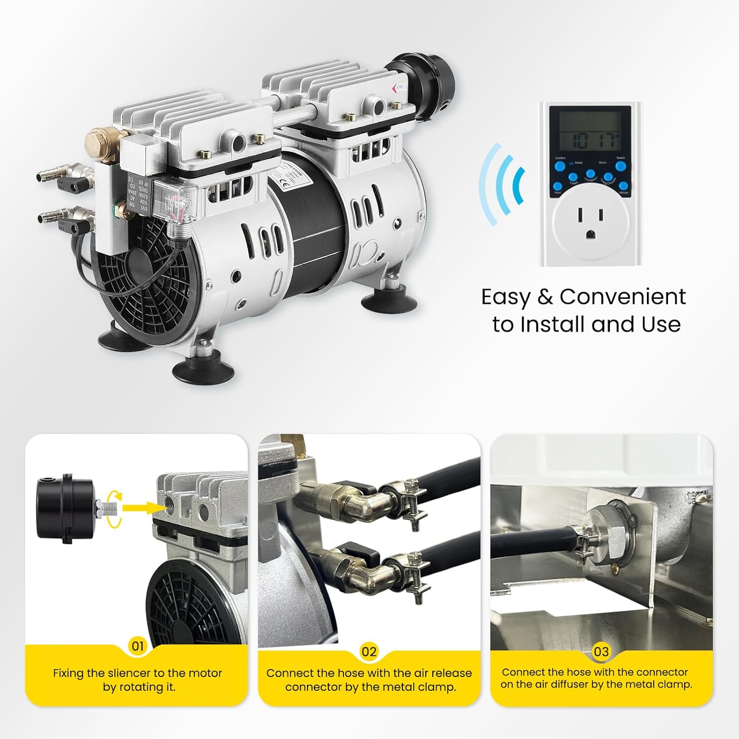 • Easy Installation — With the foot pads and silencer installed already, just connecting the air hose with the air-release connector on the air compressor by a metal clamp and connecting the air hose with the connector on the air diffuser via a metal clamp, plug the power cord to the socket and turn on the switch on the electrical box, the pond aerator for outdoor ponds could start to work