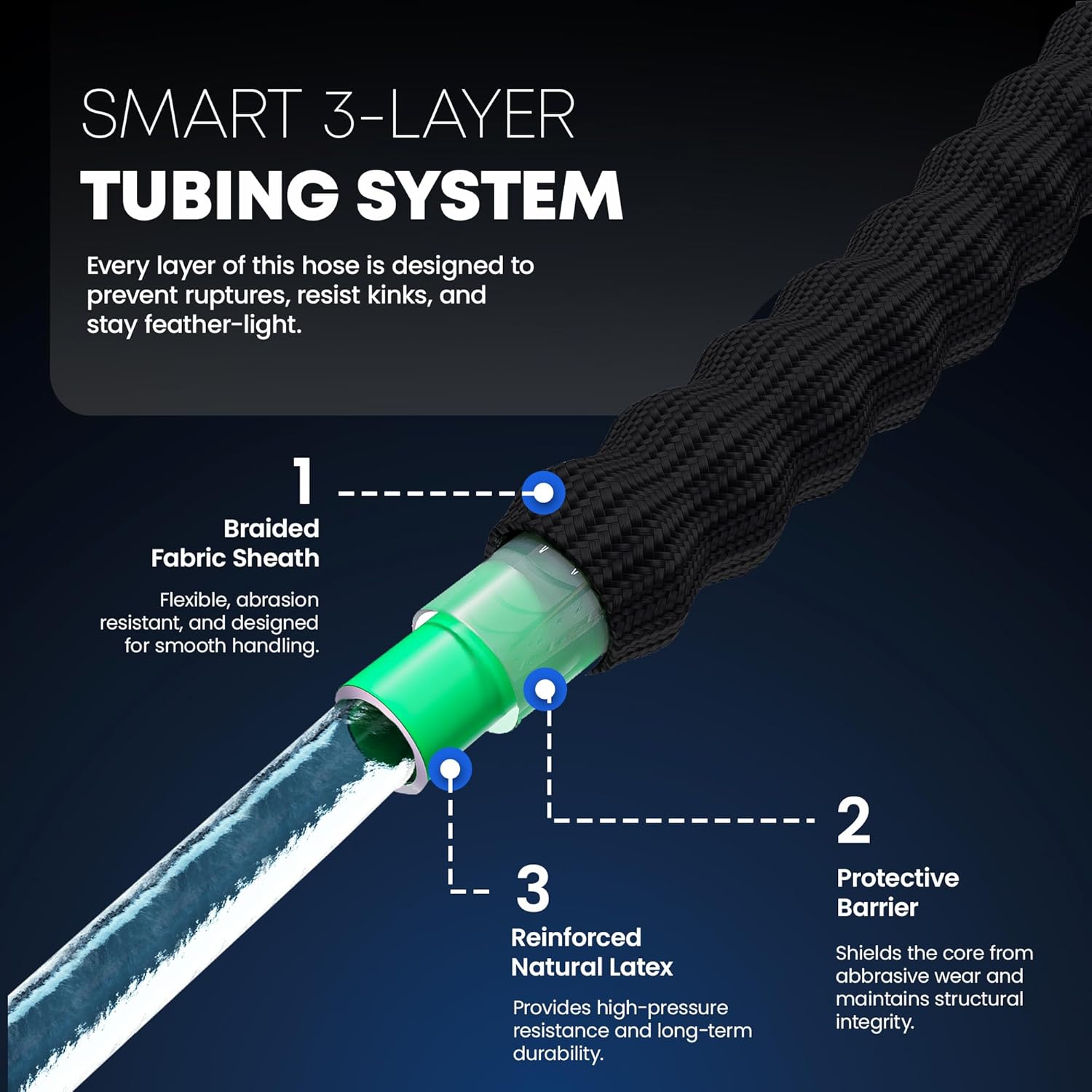 • [Universally Compatible Kink-Free Design] Engineered with standard 3/4" GHT, corrosion free, pure brass connectors, our hose fits a wide array of faucets nozzles and accessories. The ultra flexible, never kinking design contributes to a hassle-free watering experience. The triple layer construction provides a durable and manageable garden hose with dependable performance in various weather conditions.