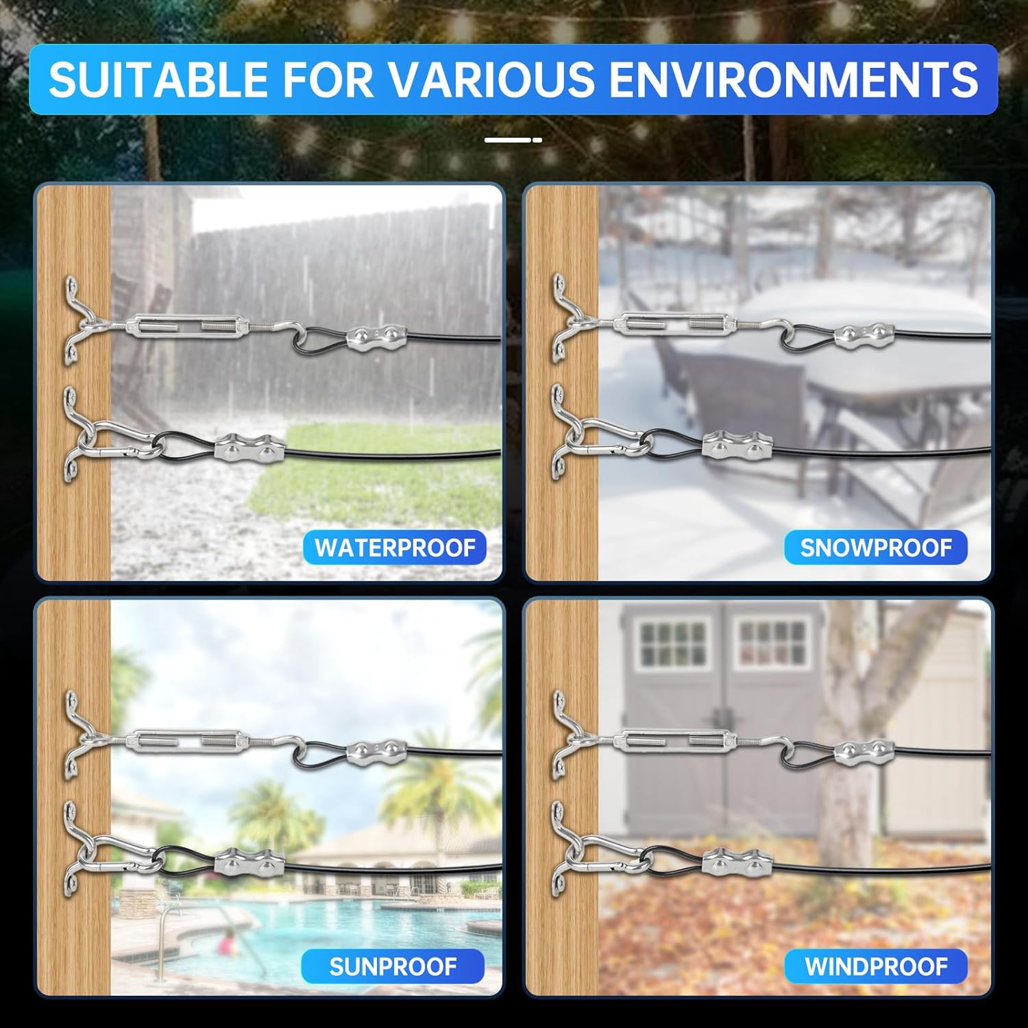 • Multi-Application Flexibility:Perfect for both commercial and residential use,Outdoor string light suspension (patio/event lighting),Greenhouse plant support systems Safety railings & gate tensioning, Retail display rigging & curtain track installation DIY projects requiring <1/8" deflection under load