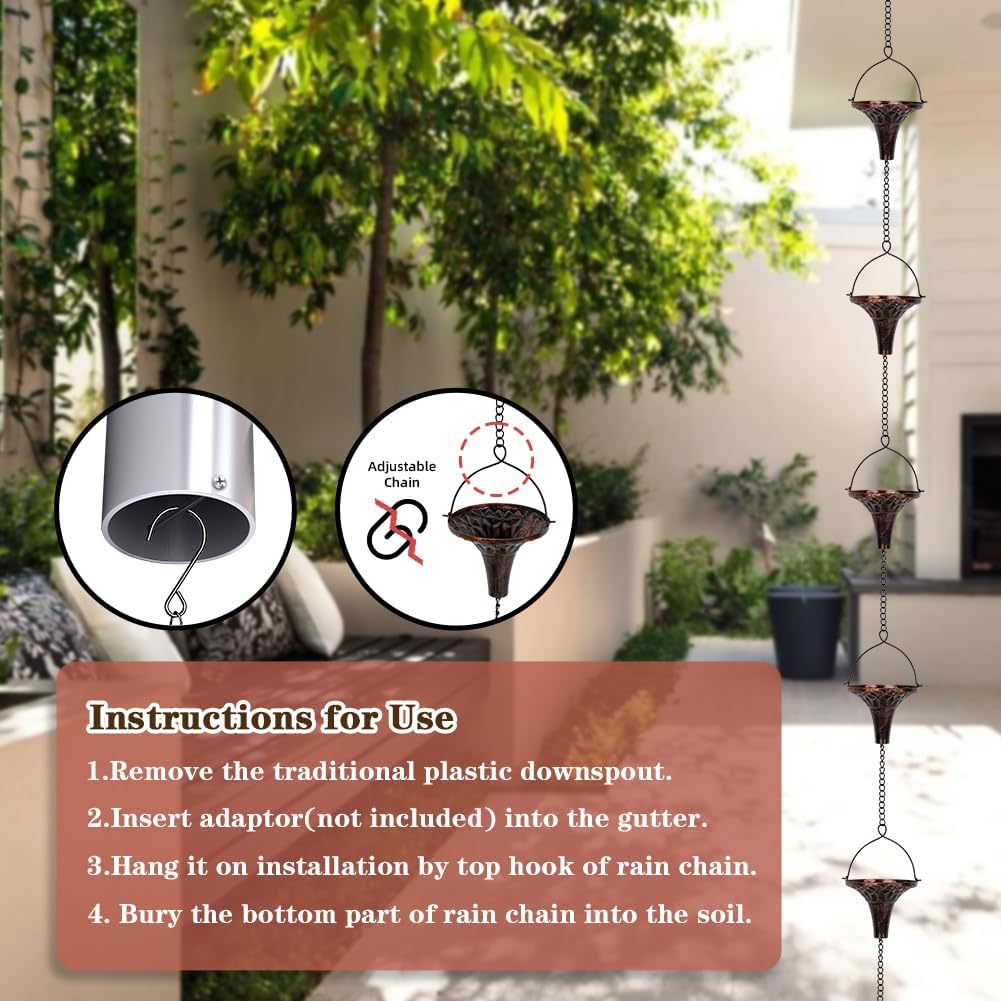 • Easy to Use: The rain catcher chain is easy to install, hang the hook on the adapter and you can use it. Decorating the eaves instantly makes your house elegant. When it rains, listening to the rain chain brings you a unique and pleasant sound, making people feel amazed