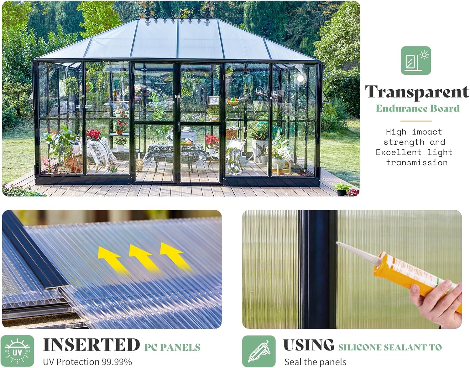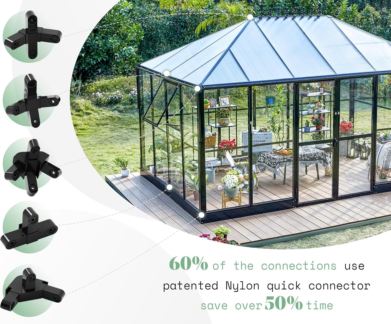 AMERLIFE 14x9.5x9 FT Hybrid Polycarbonate Greenhouse Quick Connector Fast Assembly, Swing 2 Doors Clear Panels, Walk-in Large Aluminum Greenhouse for Outdoors, Black
