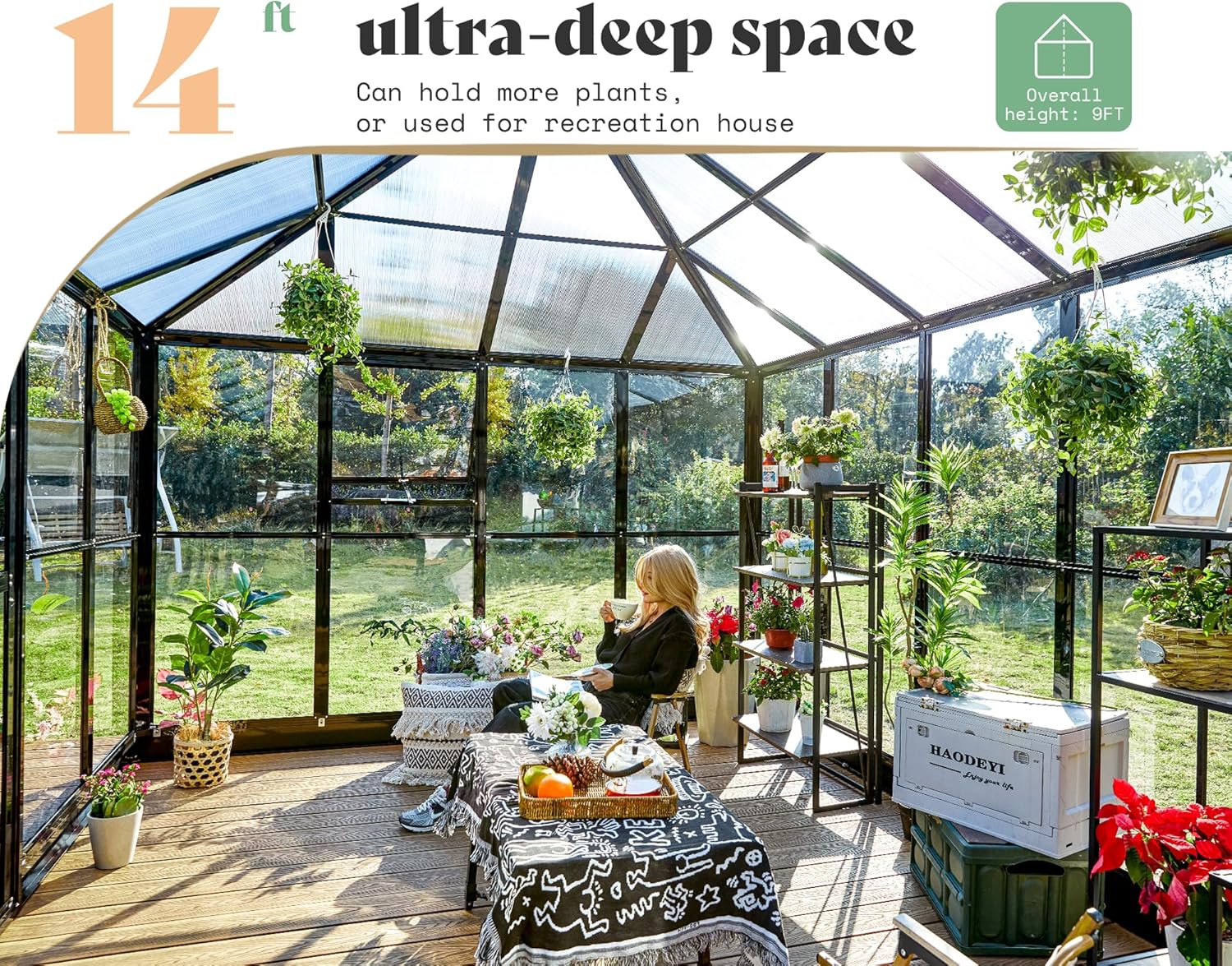 • 14x9.5FT Hobby Greenhouse & Sunroom: Anti-rust aluminum frame (1.5mm) Overall height: 9 FT, extra large space accommodating more plants, or used for recreation house, without the feeling of being cramped. Upgraded 6 FT wall height, easy to access, and no need to bend over