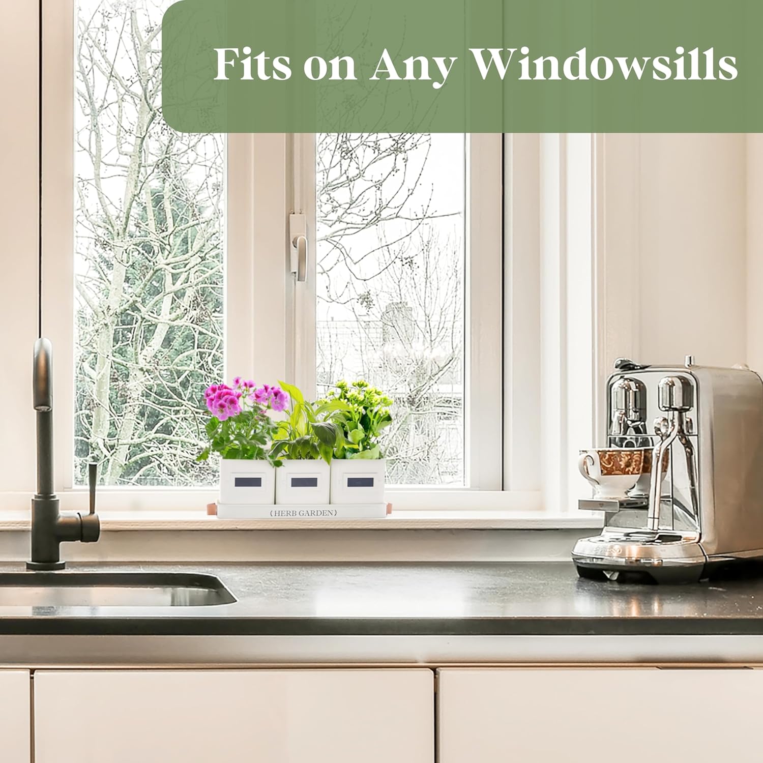 • 【Windowsill Herb Garden】Our window herb garden includes three pots and a tray with a handle, with each pot measuring 4.4" W x 4.7" H, and the tray measuring 14.2" L x 4.9" W x 1.2" H. It's ideal for growing a variety of herbs such as mint, rosemary, basil, thyme, etc. Tailored for herb growth, our indoor herb pots provide an optimal environment for nurturing your herbs. Their farmhouse design and compact size make them perfect for placement on a windowsill or kitchen countertop.