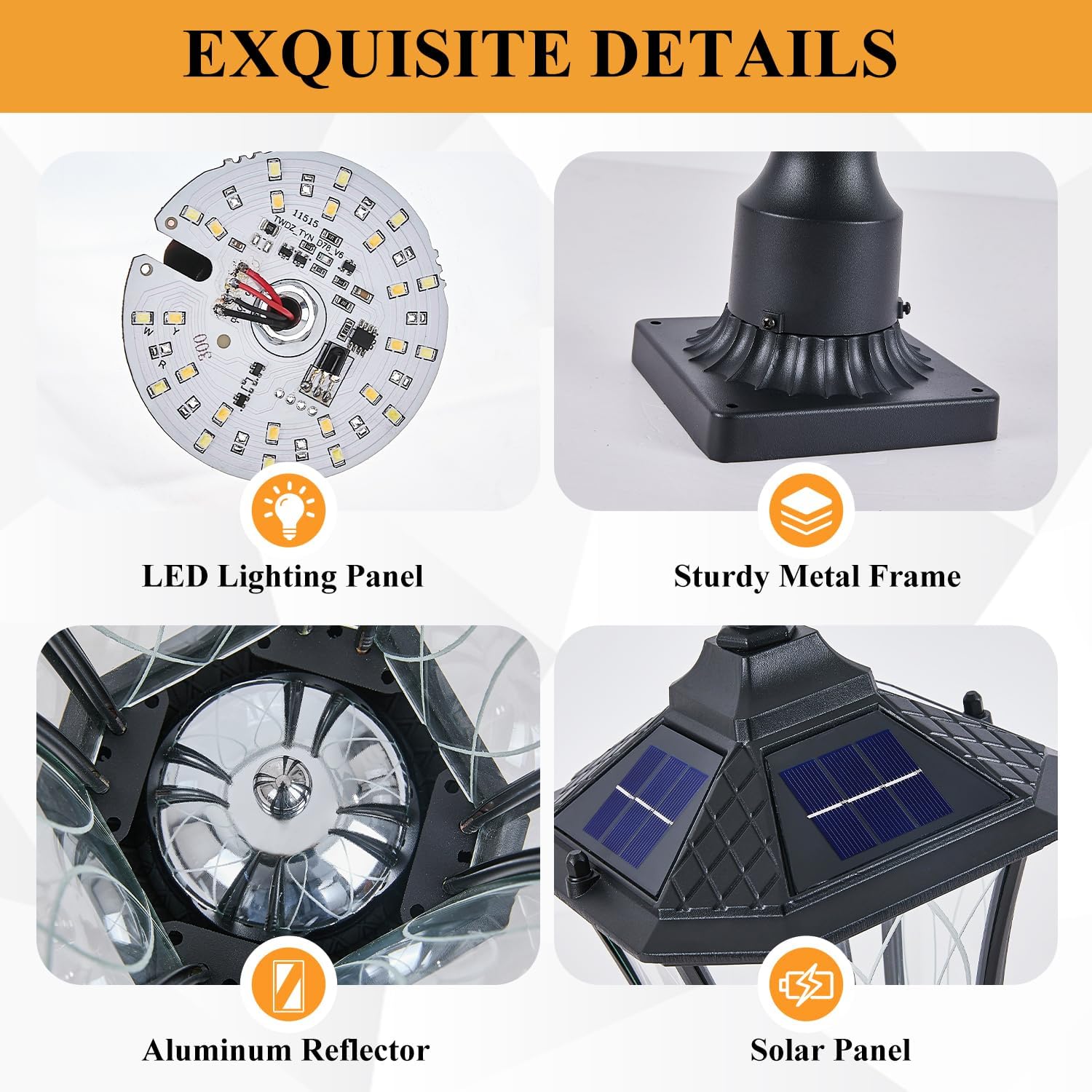 • 🔊🔊🔊NEWEST UPGRADED SOLAR POST LIGHT: The newly upgraded version comes with LED light, less likely to damage the lamp wiring, providing longer lighting time and more durable.Solar lamp post light powered by free solar energy which includes high efficiency rechargeable batteries. This solar powered lanterns will be automatically working at dusk and off at dawn as there is light sensor included.