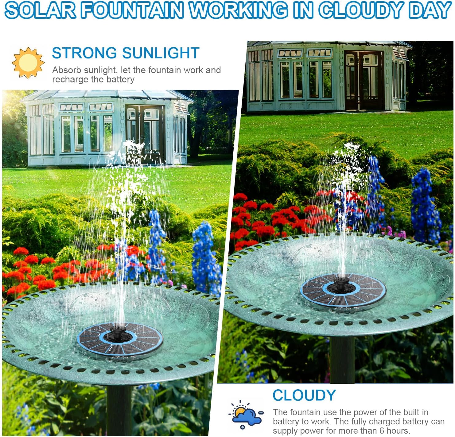 • Working on Cloudy Day:The two working modes are automatically adjusted;The sunny mode is used in sunny days;Place the solar panel in the direct sunlight,and the fountain pump starts working quikly;Don't worry if you meet a cloudy day;At this time,the solar fountain will open the cloudy mode;The fountain uses the power of the built-in battery,so that the bird bath fountain is still working happily in your garden